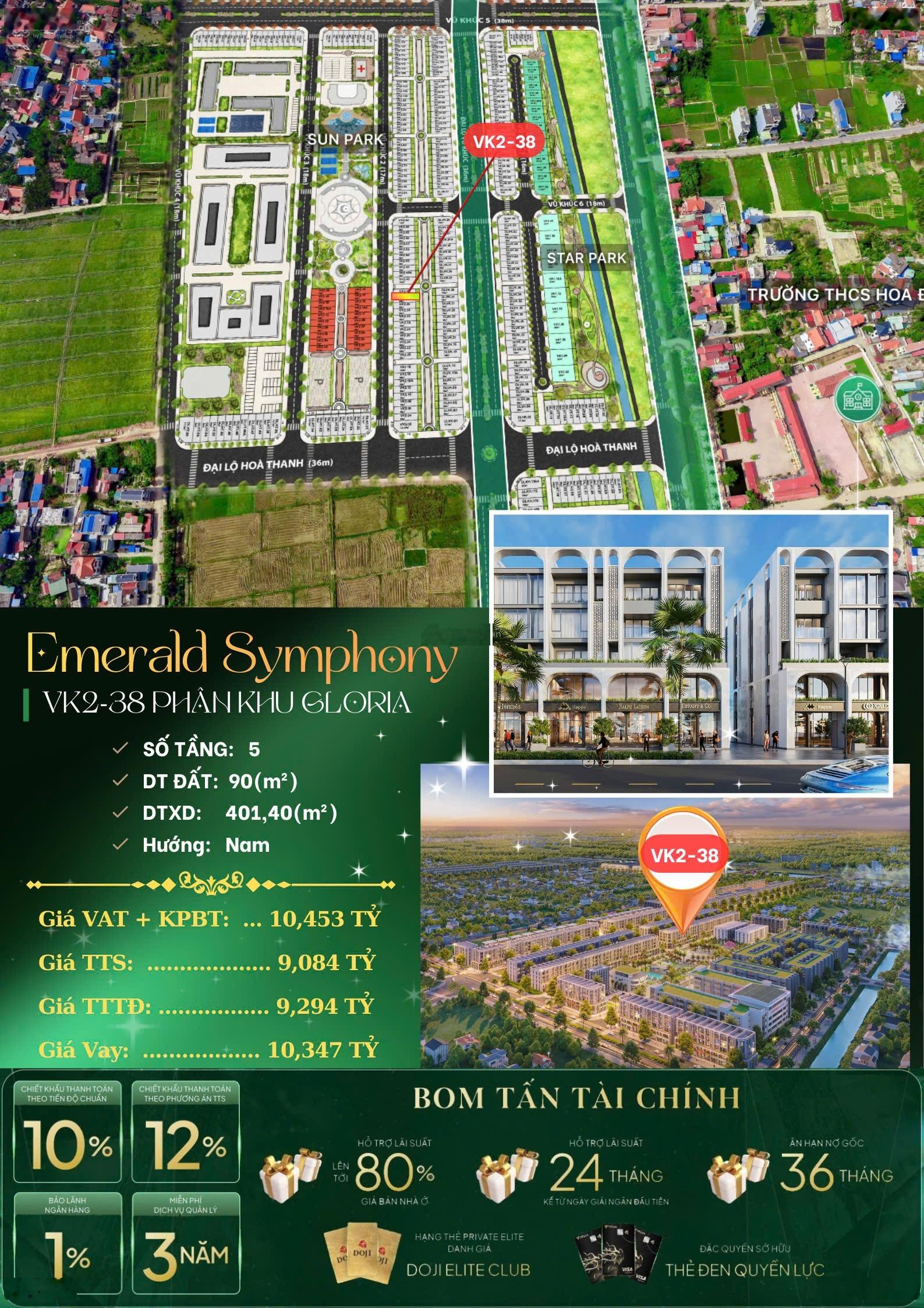 Nhà biệt thự nằm trong khu đô thị Emerald Symphony, có vị trí thuận lợi tại Phường Hoa Động, Thành phố Thủy Nguyên, Hải Phòng. Với diện tích 90m2 và giá bán 9 tỷ VND, biệt thự này hứa hẹn sẽ mang đến không gian sống lý tưởng cho gia đình. - 5 phòng ngủ rộng rãi - 5 phòng tắm hiện đại - 5 tầng thiết kế sang trọng - Mặt tiền 5m, ngõ vào rộng 30m, thuận tiện cho xe hơi - Đầy đủ nội thất: điều hòa, tủ lạnh, giường... Biệt thự có mặt tiền lý tưởng, thích hợp cho kinh doanh. Pháp lý đầy đủ, đảm bảo an tâm cho khách hàng. + Cách công viên 25/10 khoảng 2km + Gần siêu thị Lan Chi Mart Thủy Nguyên và Ngọc Am Mart + Cách bệnh viện Đa khoa Thành phố Thủy Nguyên khoảng 2km Giới thiệu tổng quan dự án Nằm tại xã Hoa Động, huyện Thủy Nguyên, TP Hải Phòng, Emerald Symphony được đầu tư bởi Công ty TNHH Đầu tư Bất động sản Dojiland (Thành viên Tập đoàn Doji). Dự án có quy mô 260.718,99m2, chia thành 3 phân khu: Gloria, Sonata, Harmonia, với tổng số 484 căn (Liền kề, Shophouse, Biệt thự), diện tích từ 80m2-225m2. Mật độ xây dựng chỉ 25,8%, 99% sản phẩm có 2 mặt tiền và vườn xanh riêng biệt. Dự án cung cấp nhiều tiện ích như công viên trung tâm, công viên ven sông, quảng trường ánh sáng, bể bơi bốn mùa, khu thể thao ngoài trời, khu vui chơi trẻ em, vườn dạo, khu gym, spa và kid's club. Để biết thêm thông tin chi tiết về biệt thự, vui lòng liên hệ Lê Nhật Minh qua số điện thoại 0938858158