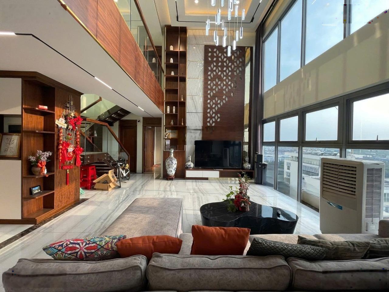 - Penthouse thuộc dạng Duplex, khoảng thông tầng phòng khách rộng 40m2, cao 8m, full kính 2 mặt phòng khách.