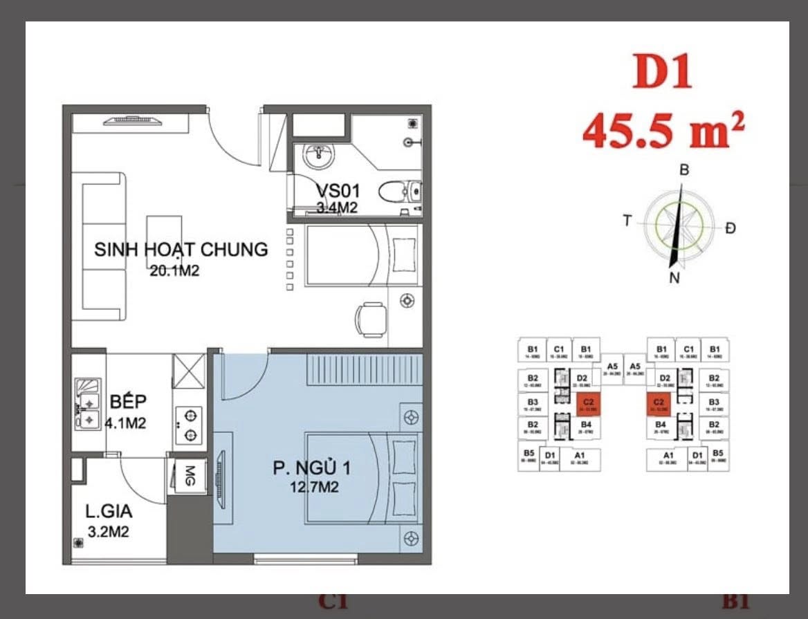 - Căn 45m2: 1 ngủ 1, tầng trung, hướng Đông Nam siêu mát, full nội thất. Giá chỉ 3.xx tỷ, sổ đỏ chính chủ.