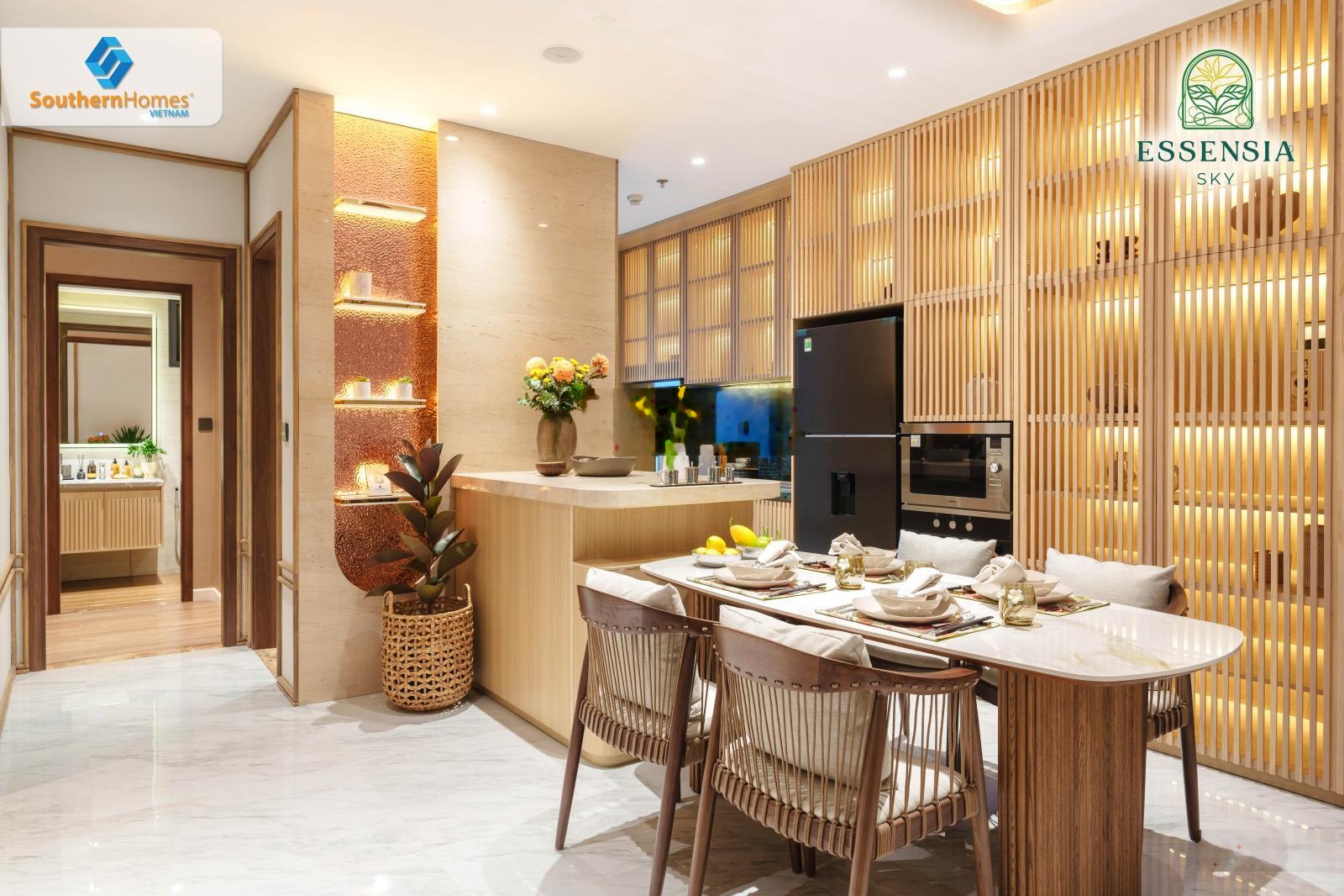 - Bàn giao hoàn thiện cao cấp: Sàn gỗ, tủ bếp, thiết bị vệ sinh Kohler.
