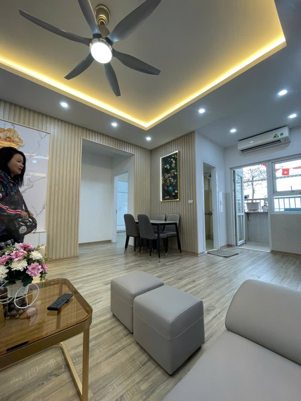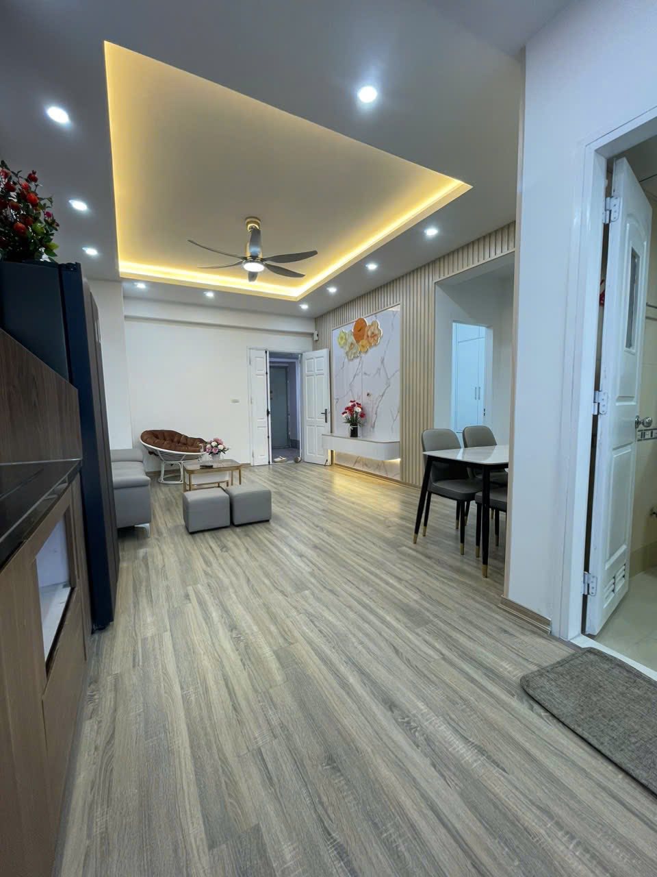Điểm nhấn đặc biệt của căn hộ là toàn bộ nội thất liền tường đều được làm từ gỗ gõ đỏ quý hiếm, mang đến vẻ sang trọng và đẳng cấp.