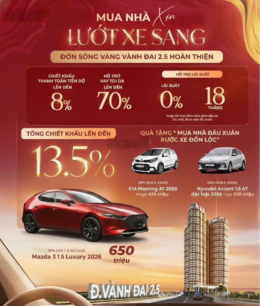 * Chào xuân 2026, cơ hội sở hữu căn hộ cao cấp tại The Queen - Vành Đai 2.5 chưa bao giờ dễ dàng và hời đến thế! Chỉ dành cho 30 khách hàng nhanh tay nhất trong tháng Giêng này. - Quà tặng "khủng" theo từng loại căn hộ: + Căn 3PN: Tặng ngay Mazda 3 1.5 Luxury 2026 (trị giá 650 triệu). + Căn 2PN (lớn): Tặng ngay Hyundai Accent 1.5 AT 2026 (Trị giá 550 triệu). + Căn 2PN (vừa): Tặng ngay KIA Morning AT 2026 (Trị giá 450 triệu). * Chính sách tài chính "siêu hời": + Tổng chiết khấu lên đến 13.5%. + Hỗ trợ vay 70% giá trị căn hộ. + Lãi suất 0% trong 18 tháng (hoặc đến khi bàn giao). - Đón sóng hạ tầng đường Vành Đai 2.5 hoàn thiện Tiềm năng tăng giá vượt trội! - Vị trí: Tâm điểm kết nối Vành Đai 2.5. - Số lượng quà tặng có hạn (Chỉ 30 suất). Đừng bỏ lỡ cơ hội "An cư lạc nghiệp - Có xe đi ngay"! - Thông tin dự án: + Vị trí: Số 360 Giải Phóng, Thanh Xuân. + Tổng diện tích đất: 4.879 m2. + Tổng diện tích sàn xây dựng: 3.030 m2. + Quy mô: 35 tầng với 900 căn hộ cao cấp. + Số tầng hầm: 4 tầng hầm ô tô và 1 hầm lửng để xe máy. + Hình thức sở hữu: Sổ đỏ lâu dài. - Thiết kế căn hộ: + Căn hộ 2PN: Diện tích 73m²-76m2-82.6m2-90m2. + Căn hộ 3PN: Diện tích 101m2-103m2 - Nội thất bàn giao: + Sàn gỗ, trần thạch cao, thiết bị vệ sinh cao cấp. + Tủ bếp, kệ bếp, bếp từ, hút mùi, máy rửa bát, lò nướng, tủ lạnh side by side,... + Tủ quần áo, Điều hòa, bình nóng lạnh,... - Giá bán: 95 triệu/m² (đã gồm VAT), mức giá đã bao gồm hoàn thiện các trang thiết bị cao cấp, TTTĐ được chiết khấu lên đến 1,3 tỷ VNĐ. Liên hệ Phòng kinh doanh: 0906201788