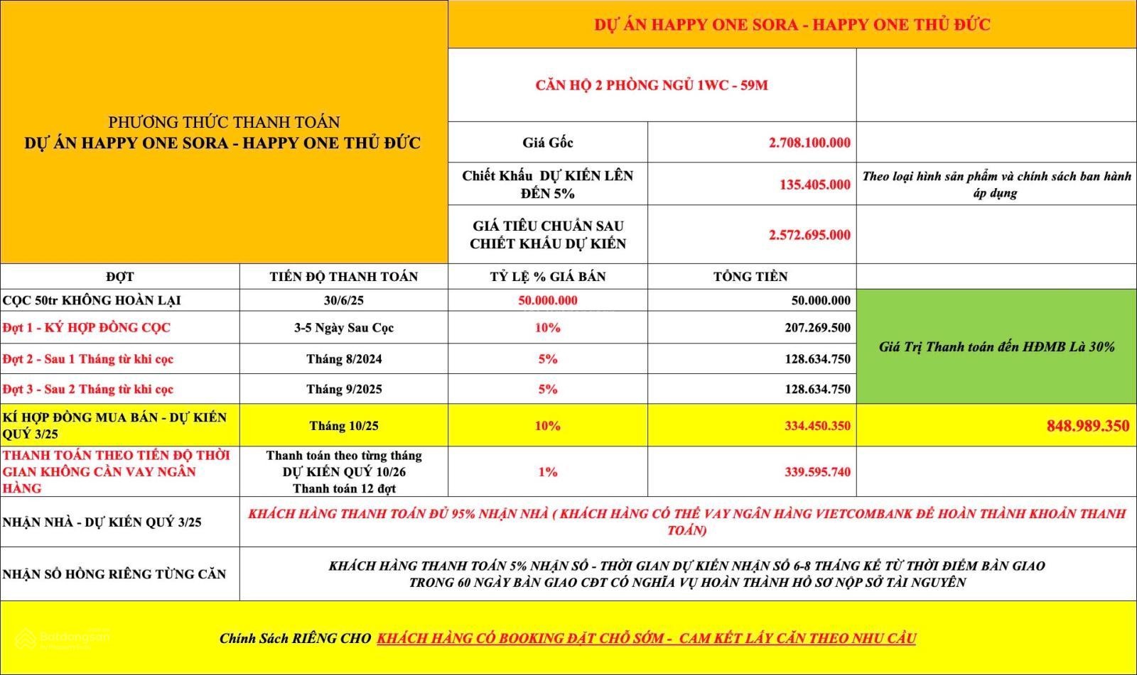 Ngân hàng Vietcombank bảo lãnh hỗ trợ vay 0% lãi suất tới nhận nhà. Sau 2 năm thanh toán 1%/tháng.