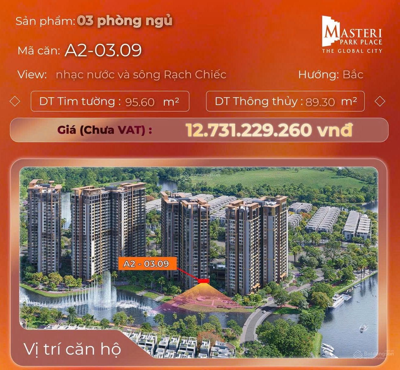 Bán căn 3PN vị trí đẹp tại Masteri Park Place trục view trực diện sông Rạch Chiếc & quảng trường nhạc nước, một trong những hướng view giá trị nhất dự án. * Thông tin căn hộ: Tháp A2 - Tầng 3 Diện tích tim tường: 95,6m² Diện tích thông thủy: 89,3m² 3PN 2WC Hướng Bắc Giá bán: 12,73 tỷ (chưa VAT & phí bảo trì), Chưa trừ ưu đãi chiết khấu và chính sách * Điểm đáng chú ý: View mở thoáng, nhìn trực diện kênh đào & nhạc nước Khoảng lùi cảnh quan rộng nên vẫn đảm bảo độ riêng tư Tổng giá tối ưu hơn nhiều căn 3PN tầng cao cùng trục Phù hợp gia đình ở thực hoặc đầu tư trung - dài hạn Hiện còn một số lựa chọn 1PN, 2PN, 3PN giá khác nhau theo tầng và view. * Liên hệ để nhận bảng so sánh chi tiết từng căn & tư vấn phương án thanh toán tối ưu nhất. Đức Lê 0935531351 Chuyên tư vấn dự án The Global City