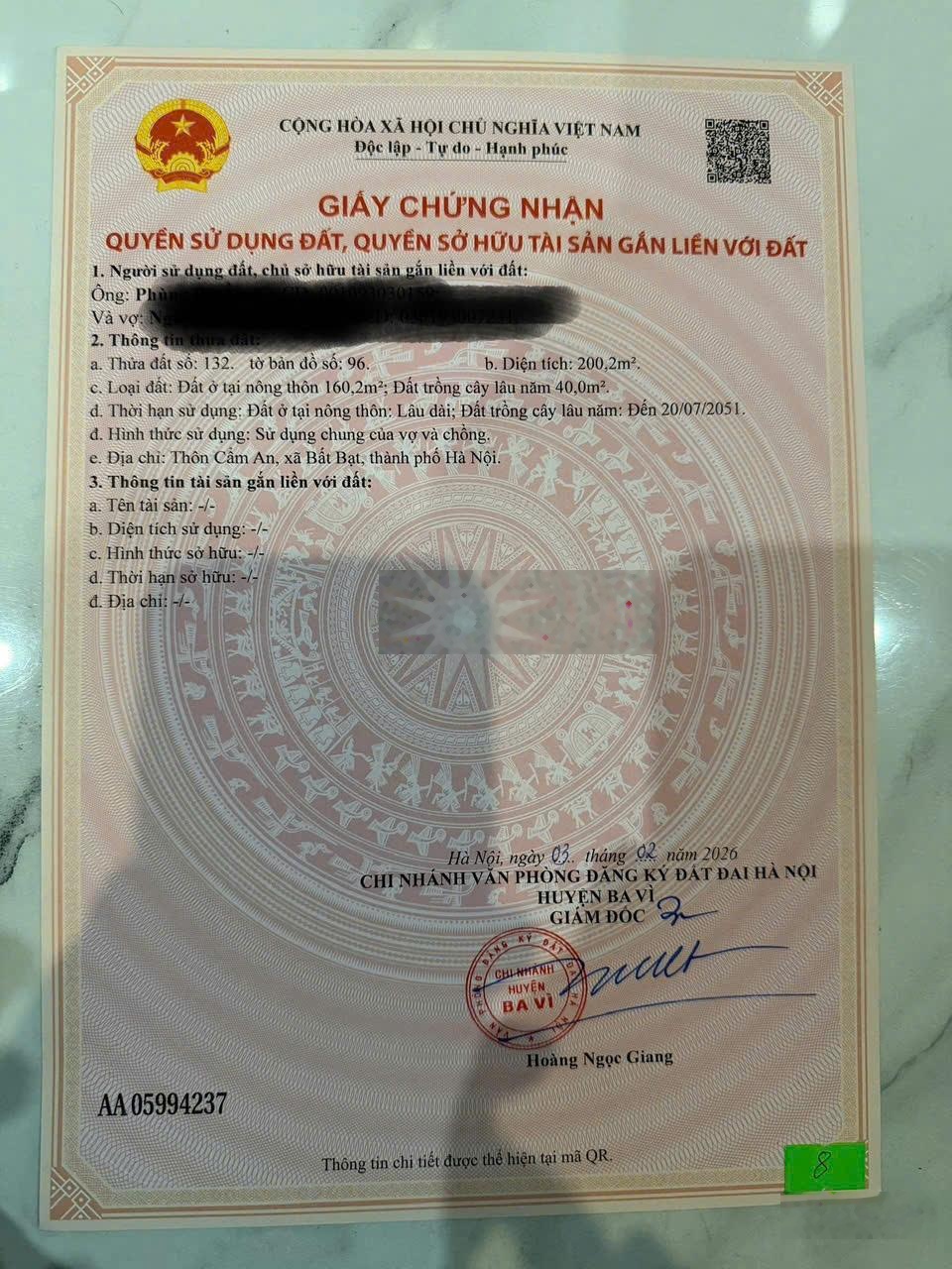 SIÊU PHẨM SIÊU ĐẸP GIÁ ĐẦU TƯ CÁCH HỒ SUỐI HAI CHỈ 1KM - Đất ở: Thôn Cẩm An, xã Bất Bạt, Tp Hà Nội - Dt: 200m2 có 160m2 đất ở, mặt tiền rộng 5 mét. - Trục đường chính liên xã, có vỉa hè rất rộng, đẹp như khu đô thị, gần mọi tiện ích... - Khu dân cư đông đúc phát triển - Phát triển kinh doanh buôn bán được - Đất Gần các khu du lịch Ba Vì - Đất nằm vị trí gần khu du lịch Hồ Suối Hai, không khí trong lành, tiềm năng du lịch nghỉ dưỡng cao. - Đất thổ cư sẵn sổ đỏ giao dịch, pháp lý rõ ràng, ranh giới bờ bao 4 bề. - Giá chỉ: 1,8 tỷ Liên hệ zalo em Mơ để em dẫn đi xem đất ạ 0332295991