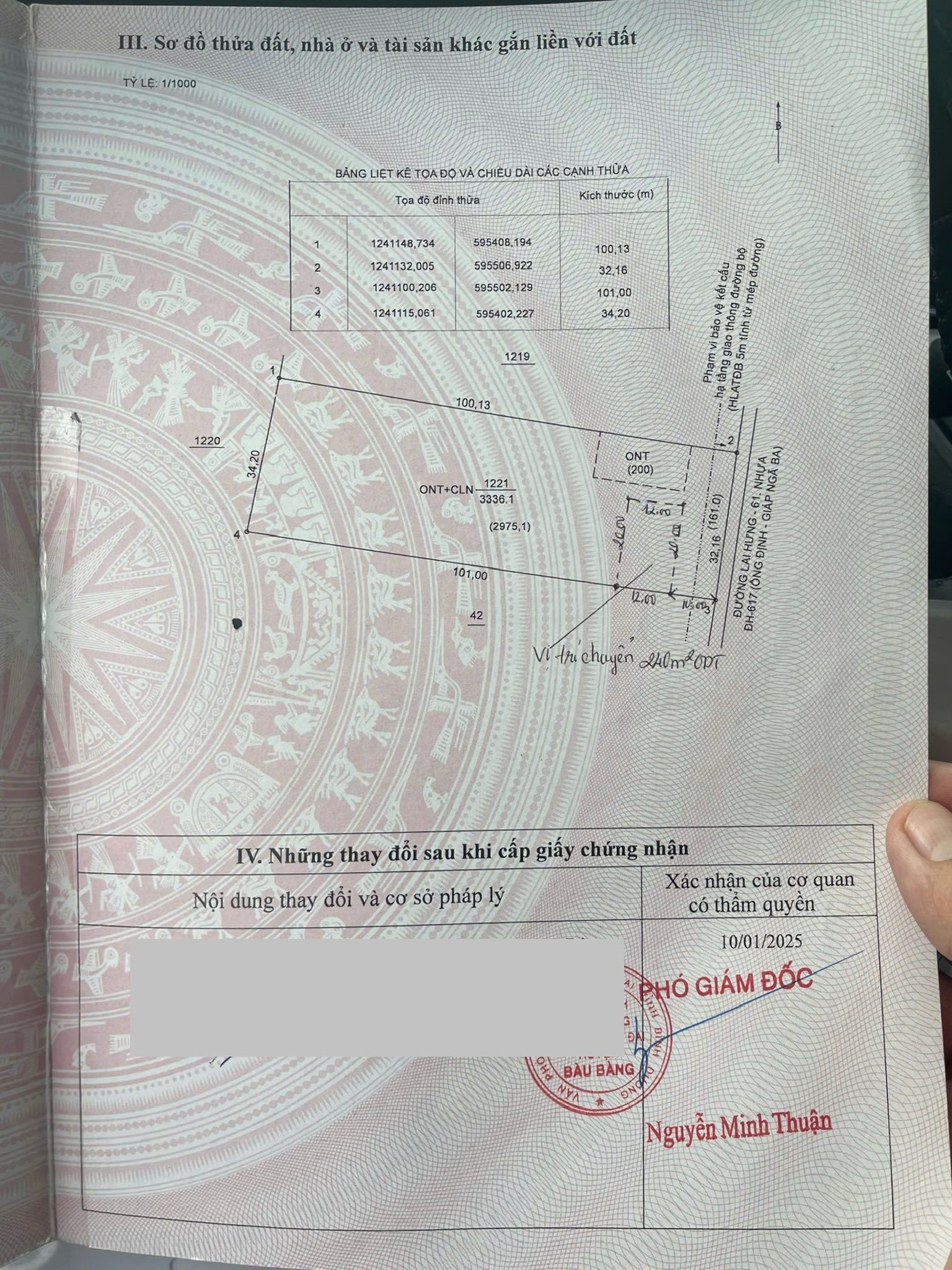 Diện tích đất rộng rãi với 3336m2, bao gồm 440m2 đất thổ cư, có kích thước mặt tiền 32m và chiều sâu 100m.