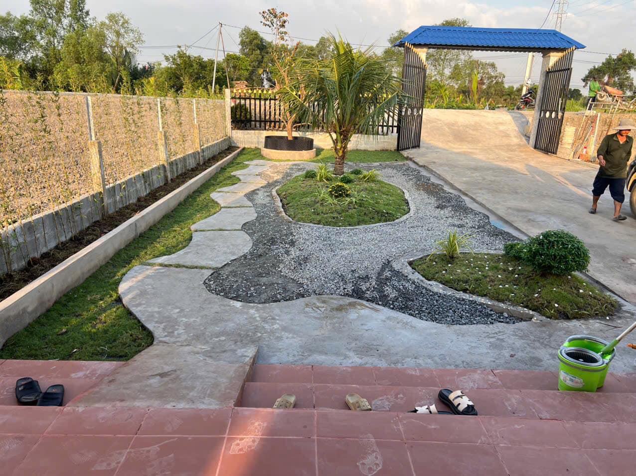 Ngôi nhà được xây dựng đầy đủ công năng, bao quanh là hàng rào kiên cố. Sân vườn rộng rãi có thể đậu được 2 chiếc ô tô, có cả hồ cá cảnh xinh xinh, bếp núc, nhà vệ sinh đầy đủ. Đặc biệt, có một phòng ngủ ấm cúng và một nhà mát lợp lá siêu mát mẻ, đảm bảo "hạ nhiệt" mọi nóng bức. Phía sau đất còn mênh mông, đang trồng đủ loại cây ăn trái như dừa, xoài, ổi, mít, vú sữa... tha hồ thưởng thức.