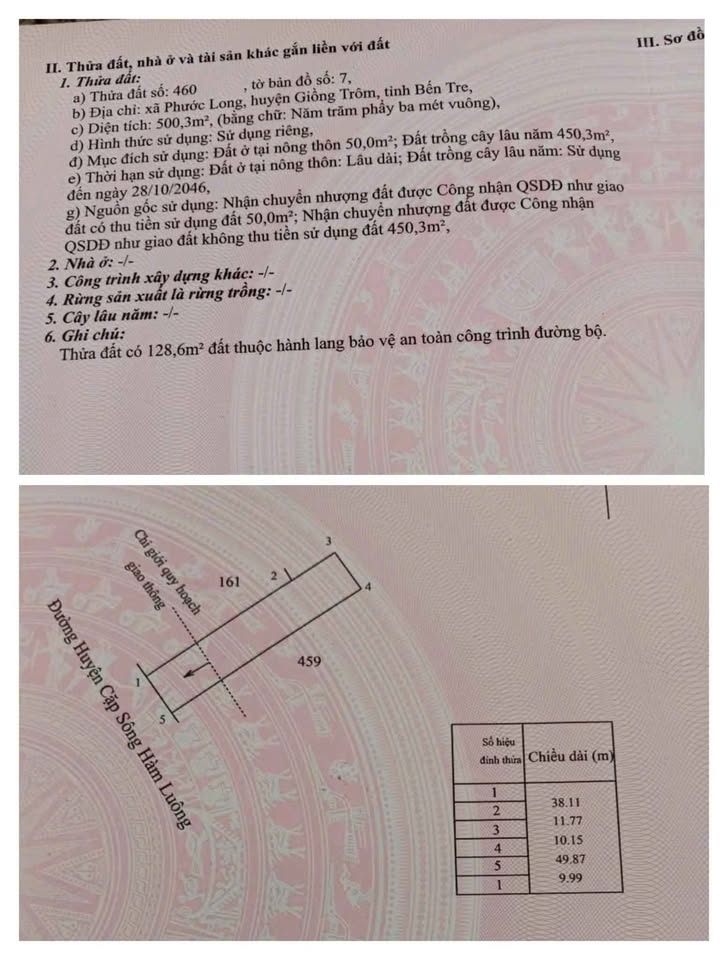 Với diện tích 500m2, bề ngang lý tưởng 10m, sâu 50m, trong đó có 50m2 thổ cư sẵn sàng cho mọi dự định.