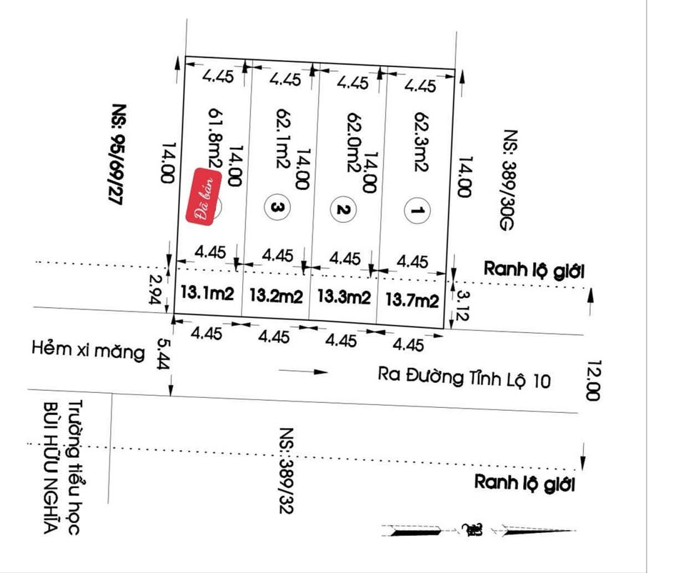 Diện tích mỗi nền là 4.45m x 17.12m, công nhận 75m2, xây dựng đủ.