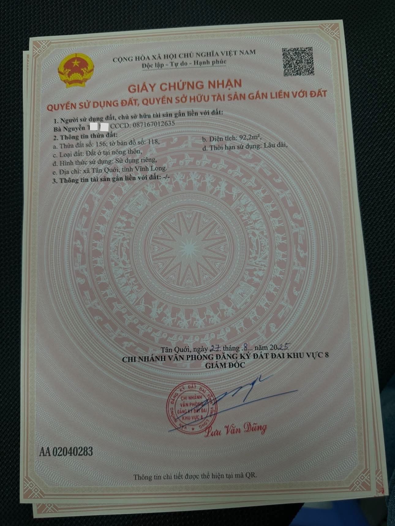 - Nền đất tọa lạc tại xã Tân Quới, Vĩnh Long, vị trí đang được chuyển đổi từ xã Tân Bình, huyện Bình Tân.