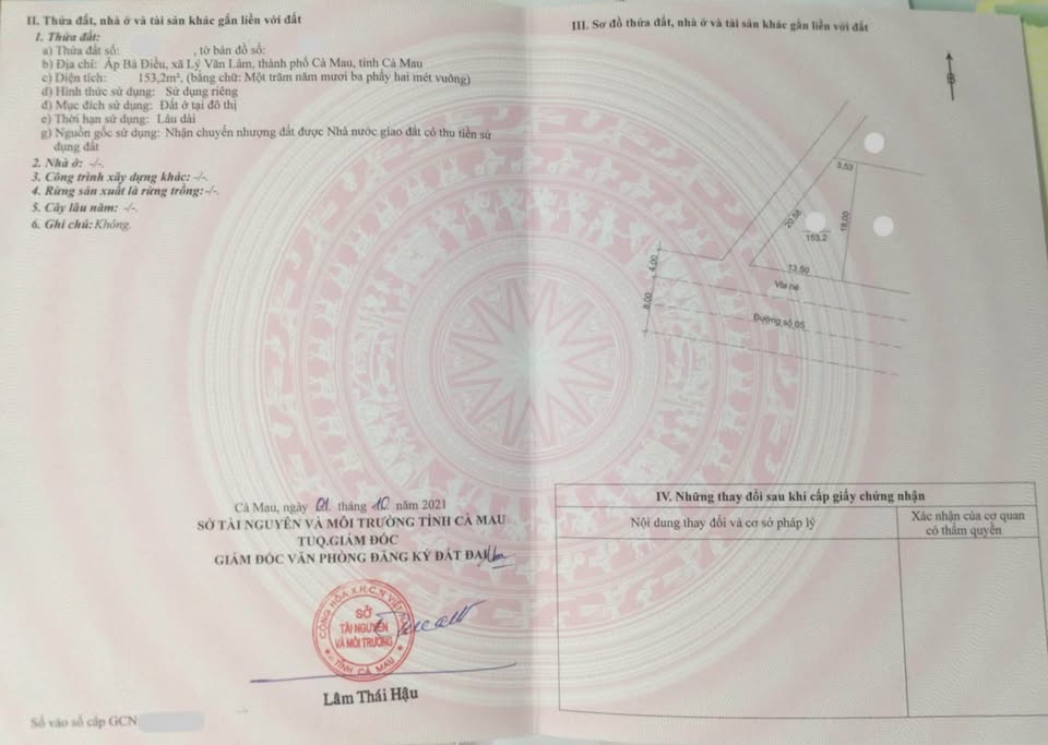 Diện tích khủng 153,2m², mặt tiền ngang ấn tượng 13,5m, hậu 3,53m, chiều dài 18m, tạo nên một không gian rộng rãi, lý tưởng để xây dựng tổ ấm hoặc kinh doanh sinh lời. Hướng Nam mát mẻ, đón gió tự nhiên, mang lại vượng khí cho ngôi nhà.