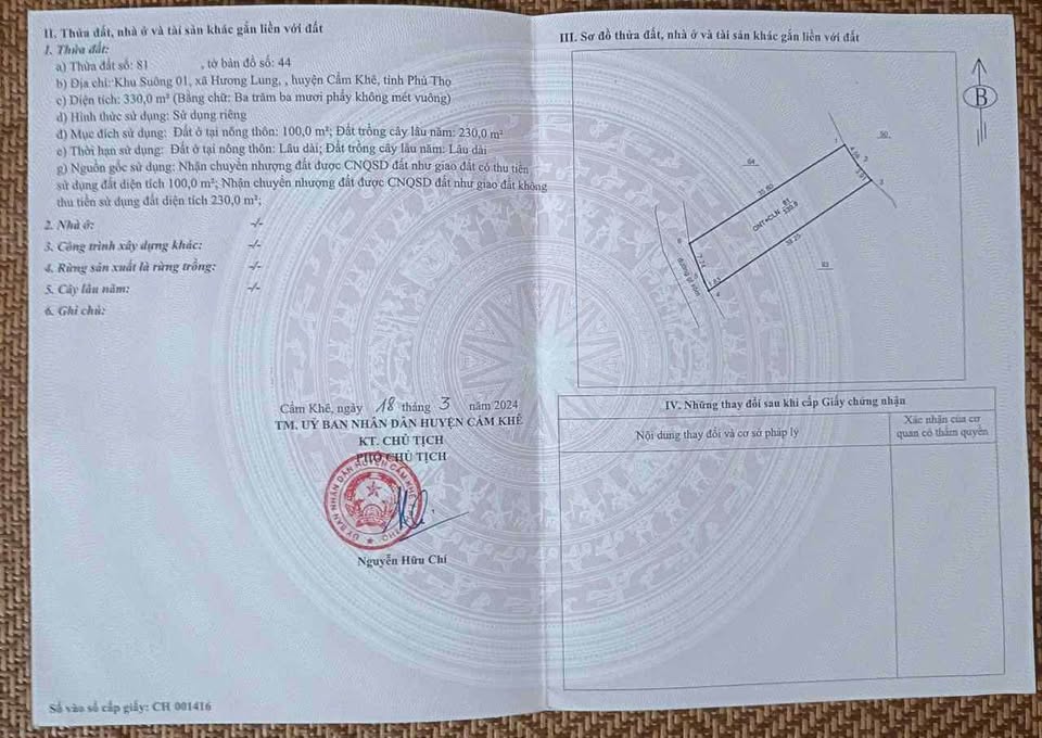 Cơ hội sở hữu ngay lô đất vuông vắn tại khu Suông 1, xã Hương Lung (nay là xã Phú Khê mới), huyện Cẩm Khê, tỉnh Phú Thọ. Với diện tích lên đến 330m2, trong đó có 100m2 đất thổ cư, lô đất có mặt tiền rộng 9.57m và chiều sâu 35m, tạo nên một không gian lý tưởng để xây dựng tổ ấm hoặc đầu tư sinh lời.