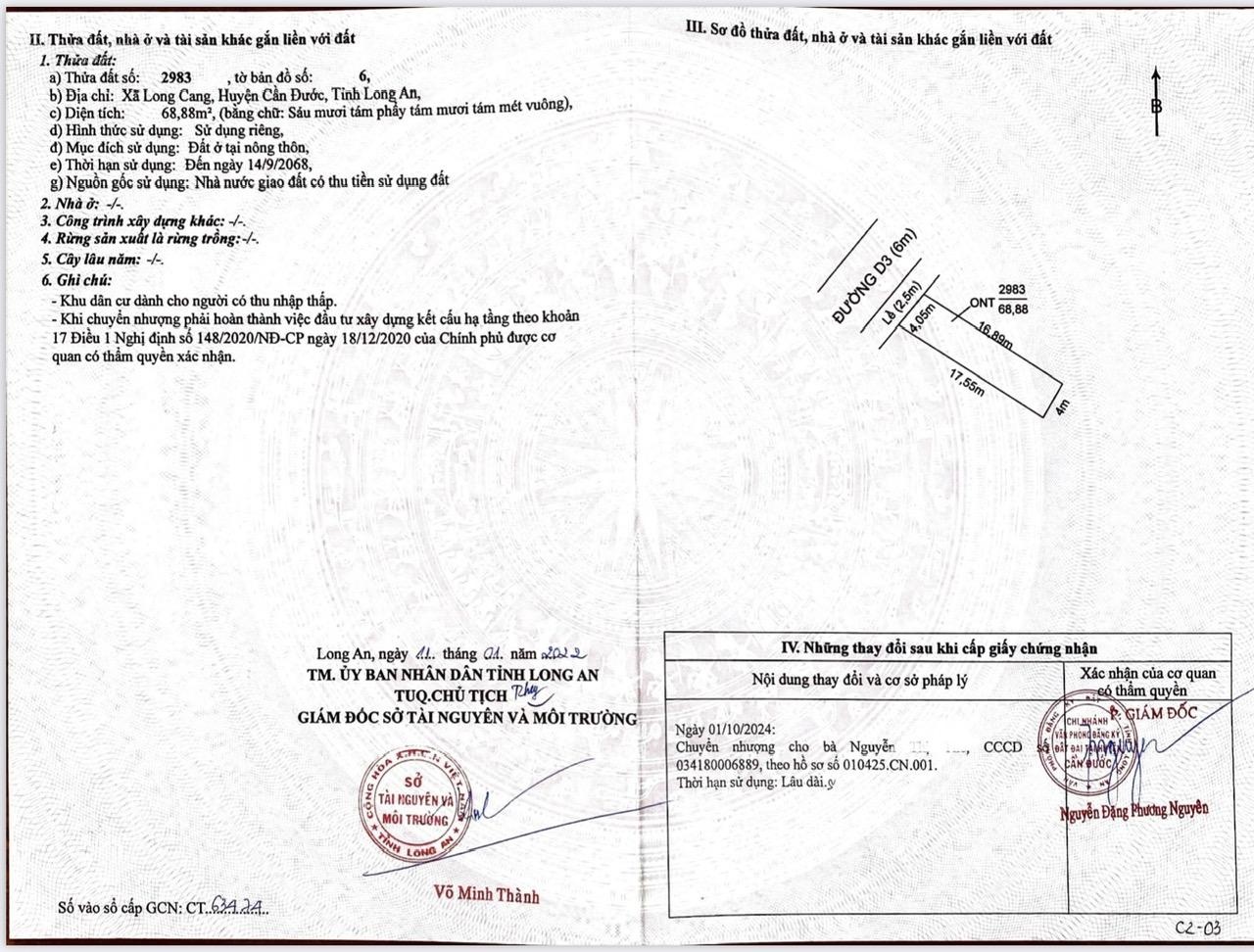 Bán cặp đất nền sổ đỏ khu quy hoạch dân cư Tây Nam Center đường Nguyễn Trung Trực xã Long Cang. Cần Đước. Long An. Diện tích: 136 mặt tiền 8m * sâu 17m Gần khu công nghiệp Thuận Đạo. Khu Công Nghiệp Prodezi sắp khởi công. Gần chợ và cảng Long Cang. Giá siêu rẻ chỉ 2tỉ150 (đầu tư sinh lời) Lh: 0367379339.