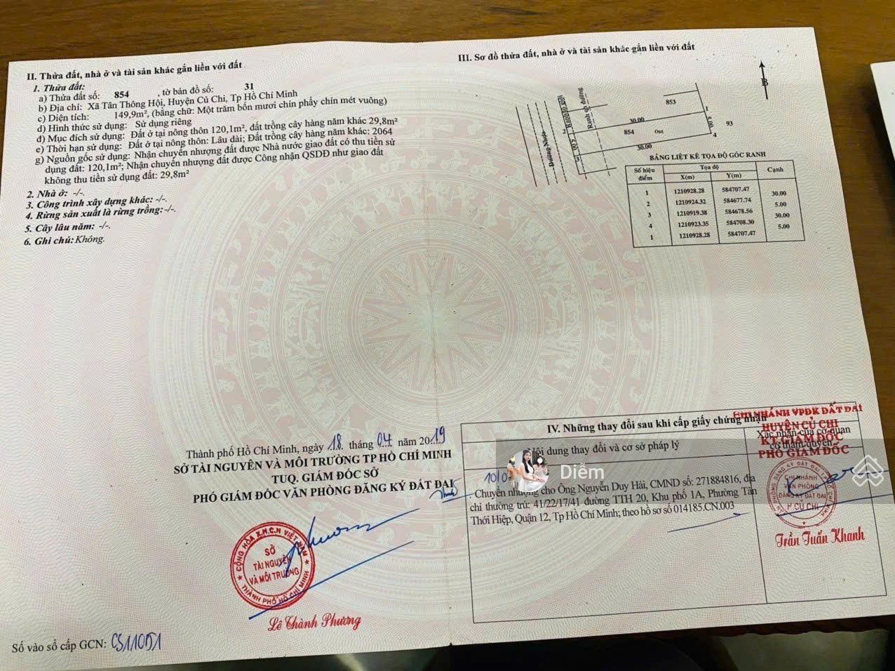 Chủ đang cần bán nhanh lô đất ở đường Lê Minh Nhựt - Tân Thông Hội - huyện Củ Chi (cũ) hiện tại thuộc Đường Lê Minh Nhựt - Xã Củ Chi - HCM - Diện tích: 150m2 (5x30m) thổ cư 120m2 mặt tiền đường nhựa, Dân cư xung quanh sầm uất, gần quốc lộ 22 cách tầm 800m, gần chợ và trường học các cấp rất thuận tiện để ở hoặc kinh doanh buôn bán - Giá: 950 triệu còn thương lượng thêm - Sổ hồng riêng, hỗ trợ vay ngân hàng Quan tâm liên hệ 0982613217 Đỗ Diễm