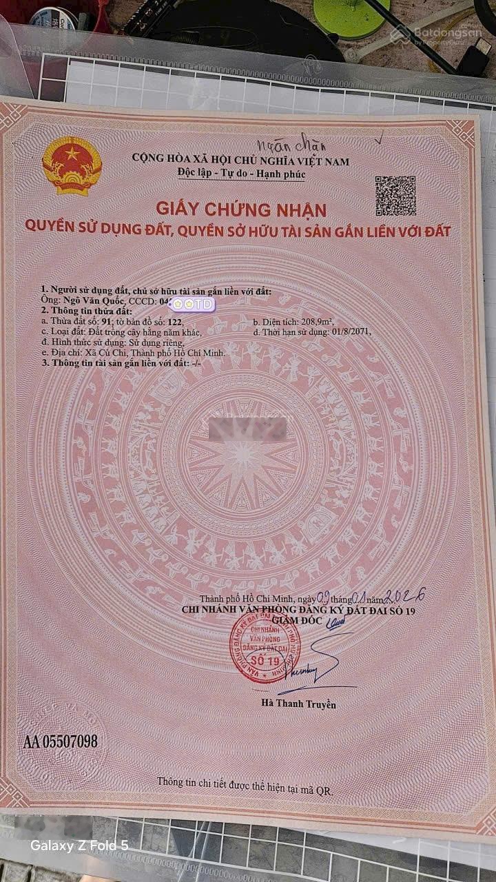 Chính chủ bán nhanh lô đất Xã Tân Thông Hội, Củ Chi. - Vị trí nằm 1/ đường Số 5. - Diện tích: 208m2 ngang 5,4m. - Đường trước nhà 5m oto chạy thoải mái. - Sổ riêng công chứng ngay. - Gía 880tr bớt lộc cho ng thiện chí. - Anh chị em quan tâm nhắn em đi xem.