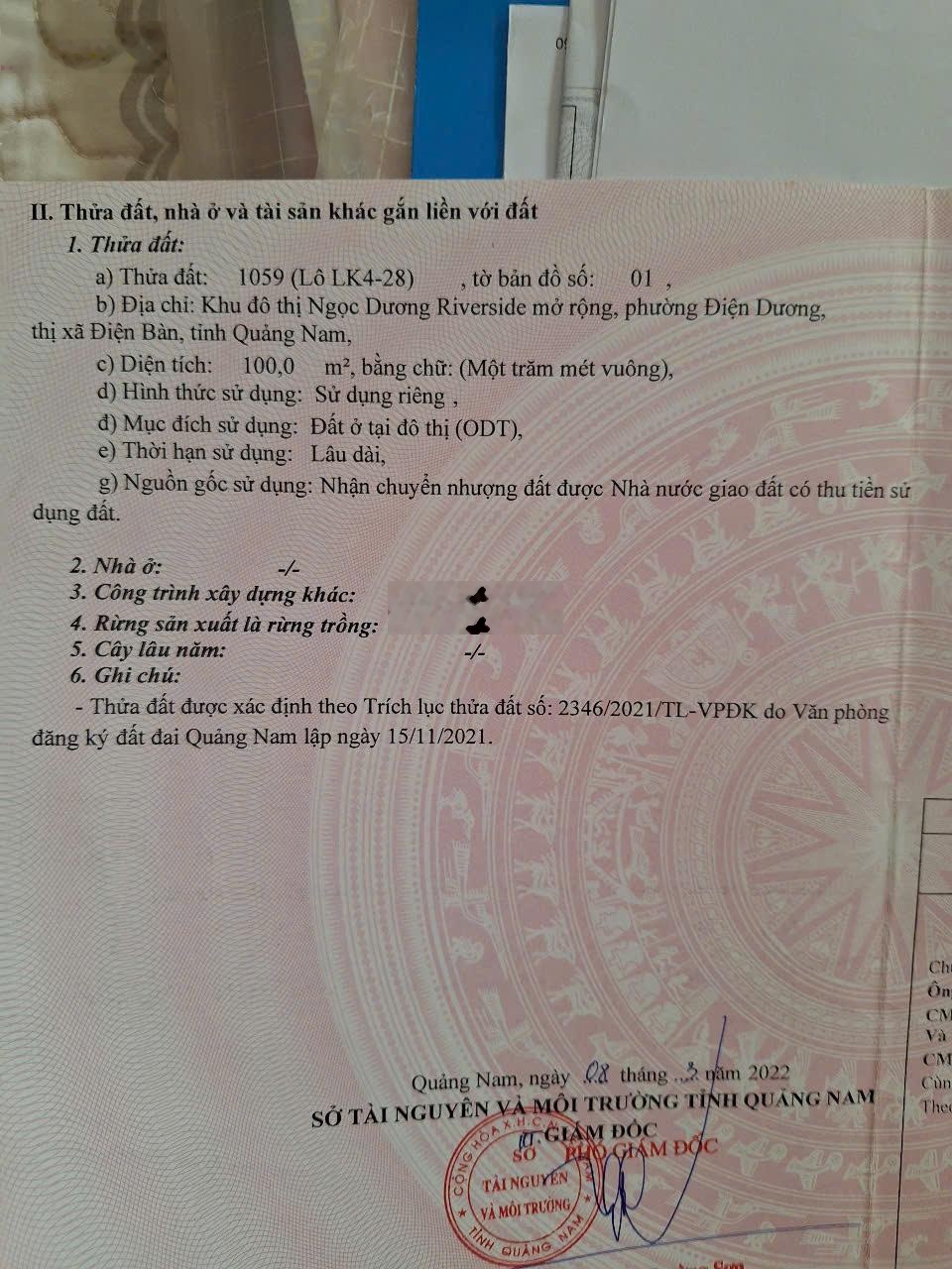 Bán Lô đất tại KDT Ngọc Dương Riverside Mở Rộng, phường Điện Dương, thị xã Điện Bàn vuông vức, đường 10,5m thích hợp ở và đầu tư. Vị trí: Khu đô thị Ngọc Dương Riverside Mở Rộng, phường Điện Dương, thị xã Điện Bàn, tỉnh Quảng Nam. Diện tích: 100m² (ngang 5m x dài 20m), mảnh đất vuông vức, dễ thiết kế xây dựng. Hạ tầng hoàn thiện: Đường rộng 10.5m, vỉa hè 5m, điện nước đầy đủ. Pháp lý: Sổ đỏ chính chủ Tiện ích xung quanh: cách biển 1km, gần trường học, chợ, cách trung tâm Đà Nẵng chỉ 15 phút. Liên hệ ngay để sở hữu mảnh đất vàng này với giá chỉ 2 tỷ 700 triệu đồng! Hỗ trợ vay bank Gọi ngay: 0915127889 A Phục