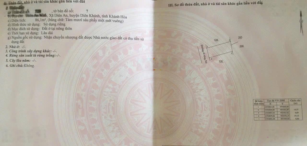 Chủ gửi bán Diên An,Diên Khánh Đường bê tông 6m oto né nhau Cách TT Nha Trang chỉ 10p di chuyển Diện tích 86m2 full thổ cư ,ngang 5m Giá bán nhanh 860 Triệu (bớt lộc) LH 0969348066 xem đất