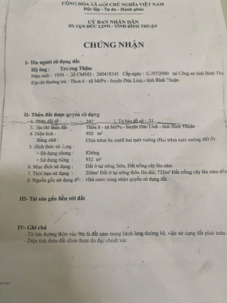 Bán đất chính chủ tại thôn 8, xã Mê Pu, huyện Đức Linh, tỉnh Bình Thuận.