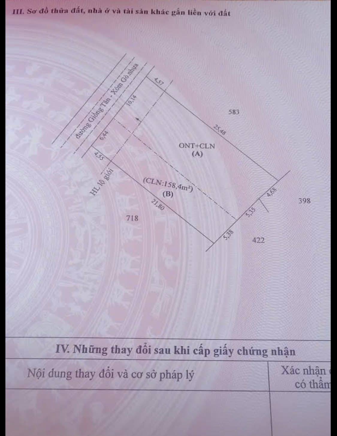 Tổng diện tích đất là 446.1m2, trong đó có 100m2 đất thổ cư và đất CLN (Cây lâu năm).