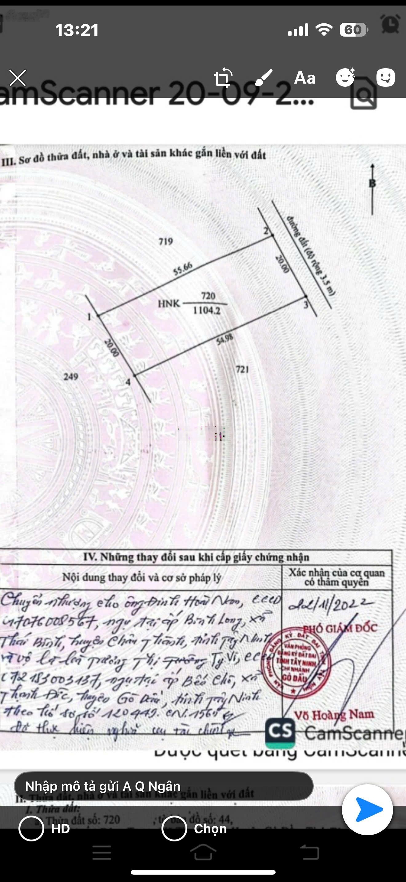 Mảnh đất nằm tại Ấp Bông Trang, Xã Thạnh Đức, Tây Ninh (Huyện Gò Dầu, Tây Ninh cũ) với diện tích 1104.2 m2, là cơ hội đầu tư tuyệt vời cho những ai đang tìm kiếm một nơi lý tưởng để xây dựng hoặc kinh doanh. Đất có pháp lý đầy đủ, phù hợp cho nhiều mục đích sử dụng. + Diện tích rộng 1104.2 m2, dễ dàng thiết kế và xây dựng theo nhu cầu. + Chiều ngang mặt tiền 20m, thuận lợi cho việc kinh doanh hoặc mở cửa hàng. + Giá chỉ 6 tỷ VND, một mức giá hợp lý cho bất động sản tại khu vực này. Mảnh đất này sở hữu phong thủy tốt, mang lại tài lộc cho chủ nhân. Với mặt tiền rộng, rất thích hợp cho việc kinh doanh hoặc xây dựng nhà ở. Pháp lý đầy đủ, giúp khách hàng yên tâm khi giao dịch. Để biết thêm thông tin chi tiết và nhận tư vấn miễn phí, hãy liên hệ với Hà Lương qua số điện thoại 0967866292