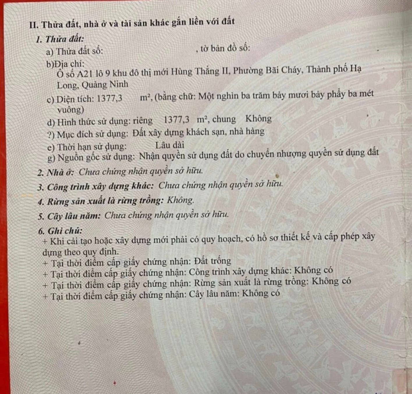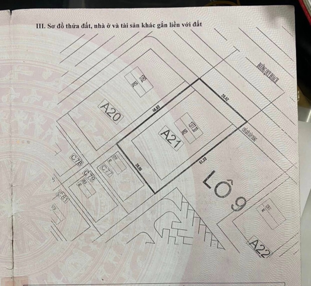 Với diện tích 1.377 m², lô đất có hình dáng vuông vắn, mặt tiền rộng rãi, cực kỳ phù hợp để phát triển khách sạn cao tầng hoặc tổ hợp dịch vụ đa năng.