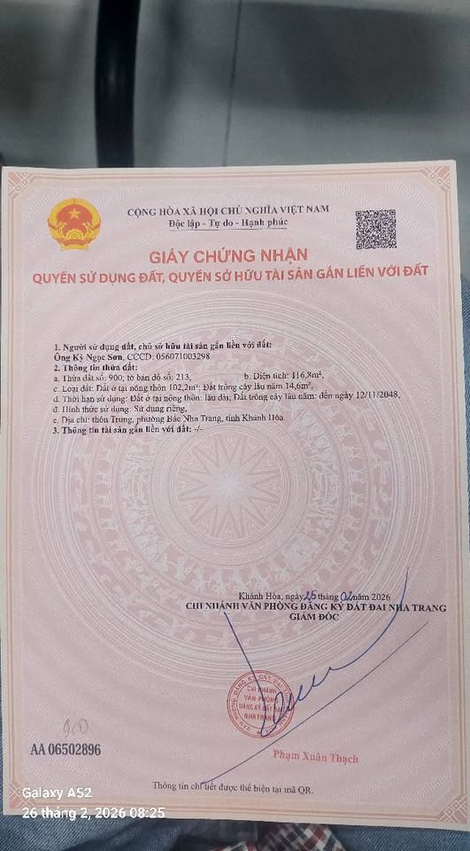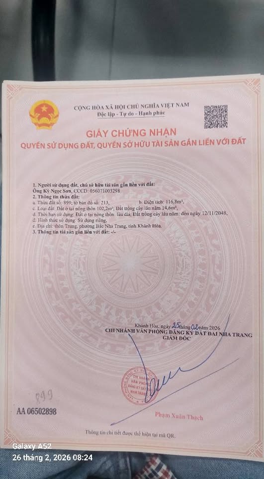 Nằm tại thôn Trung, Phường Lộc Thọ, Thành phố Nha Trang, Tỉnh Khánh Hòa, lô đất thổ cư full thổ cư này sở hữu diện tích lý tưởng với chiều ngang 6m và chiều dài 22m, mang đến không gian rộng rãi và tiềm năng phát triển vượt trội.
