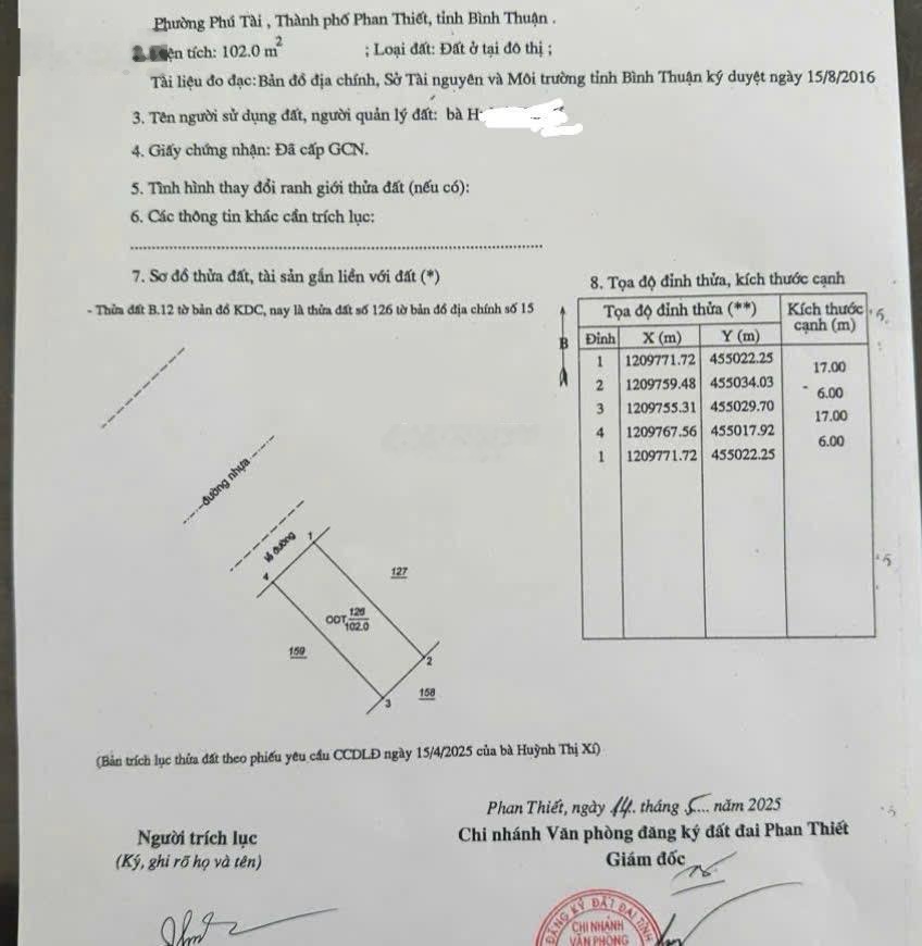 Đất nền tại Nguyễn Văn Siêu, Phú Trinh, Phan Thiết, Bình Thuận với diện tích 102 m2, là lựa chọn lý tưởng cho những ai đang tìm kiếm một không gian sống thuận tiện và đầy tiềm năng.