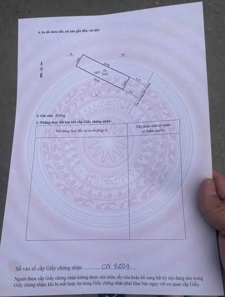Diện tích lô đất là 100m2 với mặt tiền rộng 5m, hứa hẹn một không gian thoáng đãng và tiềm năng xây dựng đa dạng.