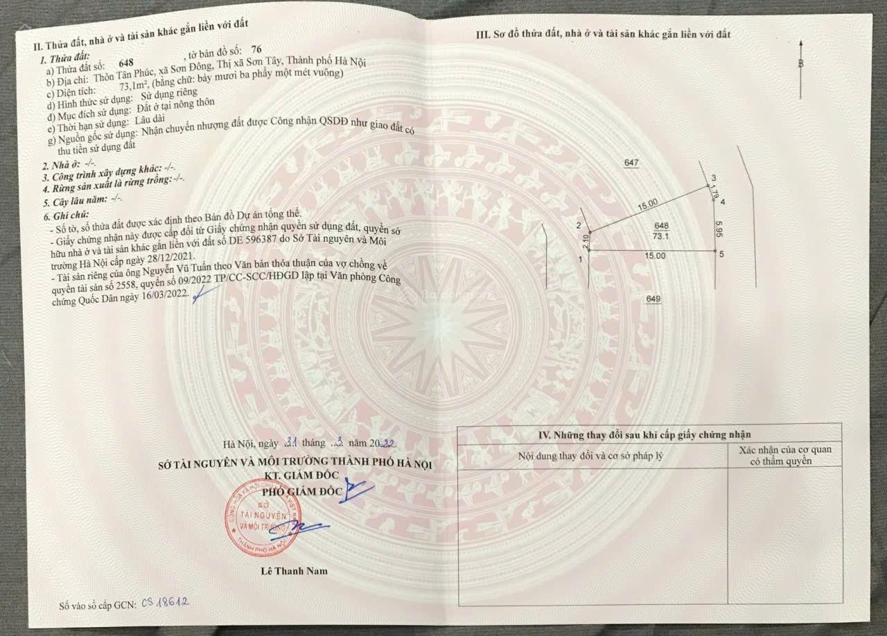Đất nền tại Xã Đoài Phương, Hà Nội, trước đây Thị xã Sơn Tây, Hà Nội với diện tích 73 m2, giá 20 triệu / m2. - Diện tích rộng rãi, phù hợp xây dựng nhà ở hoặc đầu tư. - Vị trí đẹp, thuận lợi cho việc di chuyển và sinh sống. - Hạ tầng hoàn thiện, dễ dàng kết nối đến các khu vực lân cận. Điểm nổi bật: - Phong thủy tốt, mang lại tài lộc cho gia chủ. - Khu vực yên tĩnh, thích hợp cho gia đình. Tiện ích xung quanh: - Gần siêu thị Lan Chi, thuận tiện cho việc mua sắm. - Gần các trường học như Trường Võ Bị Trần Quốc Tuấn, Trường Sĩ Quan Lục Quân 1, thuận lợi cho việc học tập. Liên hệ để biết thêm chi tiết: 0362792868, Hoàng Bình.