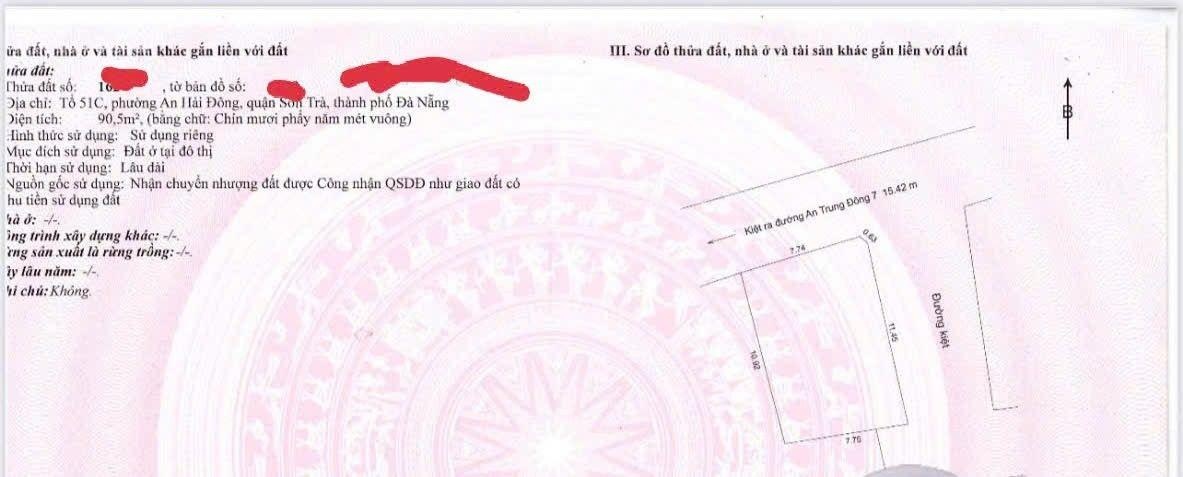 Bán lô đất sát mặt tiền Võ Văn Kiệt, Sơn Trà 90m2 Ngang hơn 7m Kiệt nhựa 5m Gần biển Mỹ Khê Cần bán lô đất đẹp vị trí trung tâm quận Sơn Trà, sát trục đường Võ Văn Kiệt, khu vực kinh doanh sầm uất, tập trung nhiều khách sạn và căn hộ dịch vụ cao tầng. Thông tin chi tiết: Diện tích: 90m2 Mặt tiền: hơn 7m (rất hiếm trong khu vực) Đường kiệt nhựa: 5m Kẹp kiệt 2 mặt thoáng Thế đất vuông vức, dễ thiết kế xây dựng Vị trí đắc địa: Vài bước chân ra Cầu Rồng Di chuyển nhanh ra Bãi biển Mỹ Khê Khu du lịch trọng điểm Sơn Trà, khách du lịch quanh năm Tiện ích xung quanh đầy đủ: nhà hàng, khách sạn, quán café, trung tâm thương mại Tiềm năng đầu tư: Phù hợp xây khách sạn mini, căn hộ dịch vụ, homestay hoặc villa cao cấp Khu vực có giá trị khai thác lưu trú cao Quỹ đất gần biển Sơn Trà ngày càng khan hiếm Đây là lô đất đẹp, ngang lớn, vị trí trung tâm hiếm có trên thị trường hiện nay. Thích hợp đầu tư giữ tài sản lâu dài hoặc khai thác kinh doanh ngay. Liên hệ xem đất và làm việc chính chủ.