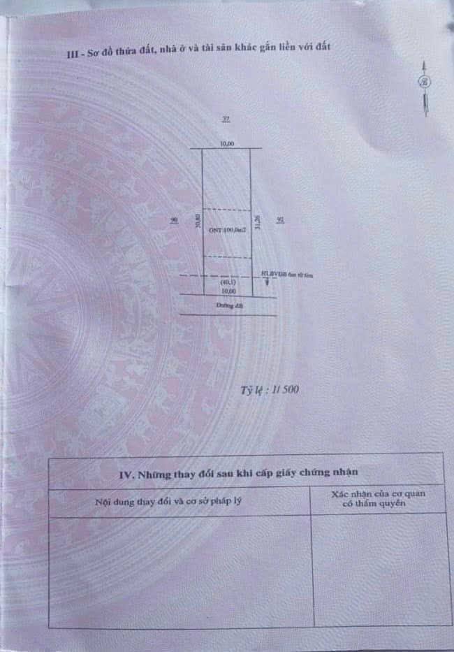 Với kích thước lý tưởng 10m x 31m, diện tích 100m2 đất thổ cư, lô đất này là sự lựa chọn hoàn hảo cho những ai đang tìm kiếm một không gian để xây dựng tổ ấm hoặc đầu tư sinh lời bền vững. Diện tích vuông vắn, dễ dàng cho việc thiết kế và xây dựng.