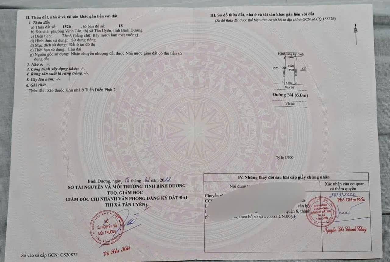 Diện tích 75m2 (ngang 5m, dài 15m), thổ cư đầy đủ, pháp lý minh bạch.
