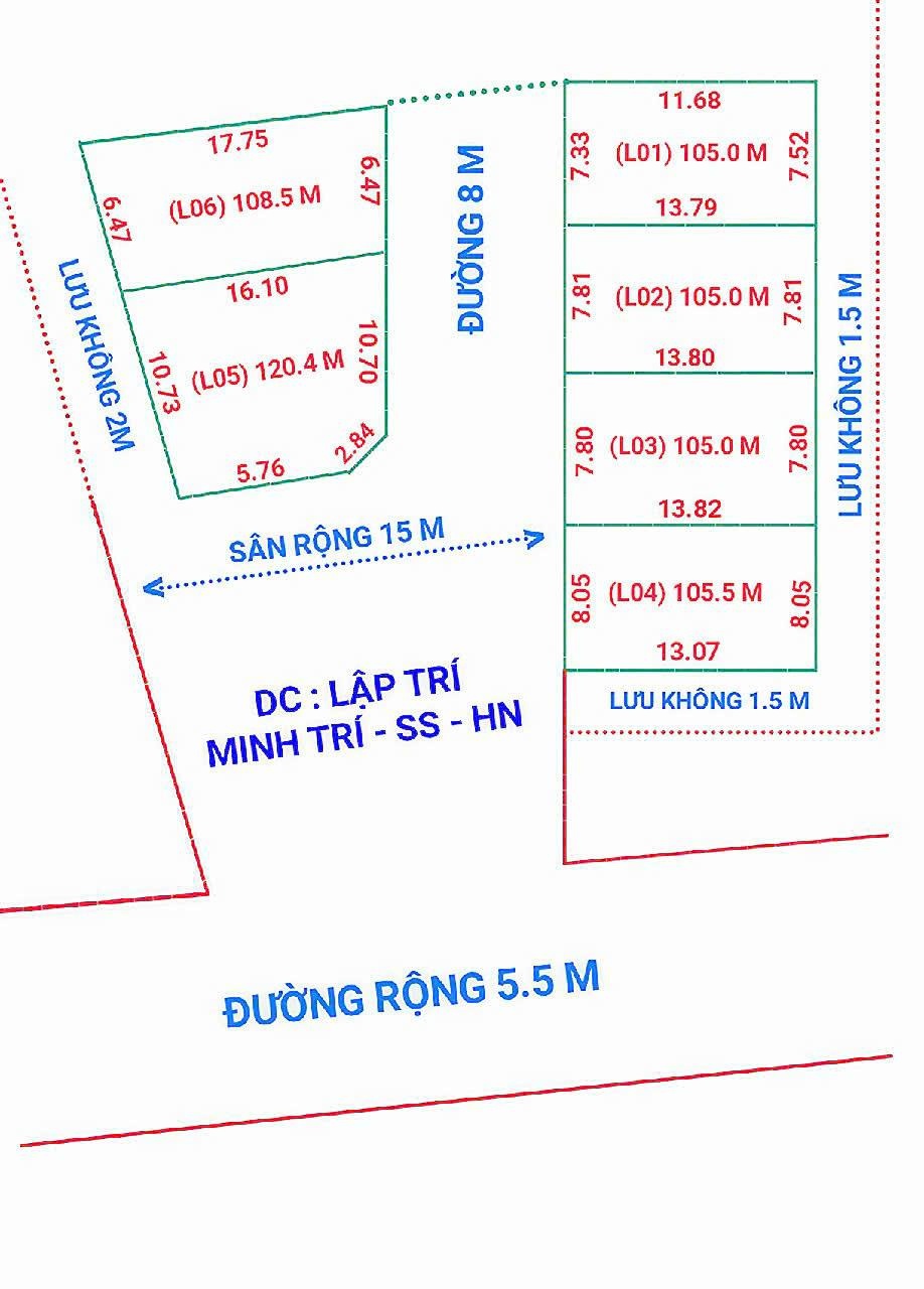 Đất thổ cư tại Lập Trí, Minh Trí, Sóc Sơn, Hà Nội đang chờ đón chủ mới. Diện tích 105m2, giá chỉ 18,5 triệu / m2. Mặt tiền rộng 7.33m, ngõ vào rộng 5.5m, cực kỳ thuận tiện cho việc xây dựng nhà ở hoặc kinh doanh.