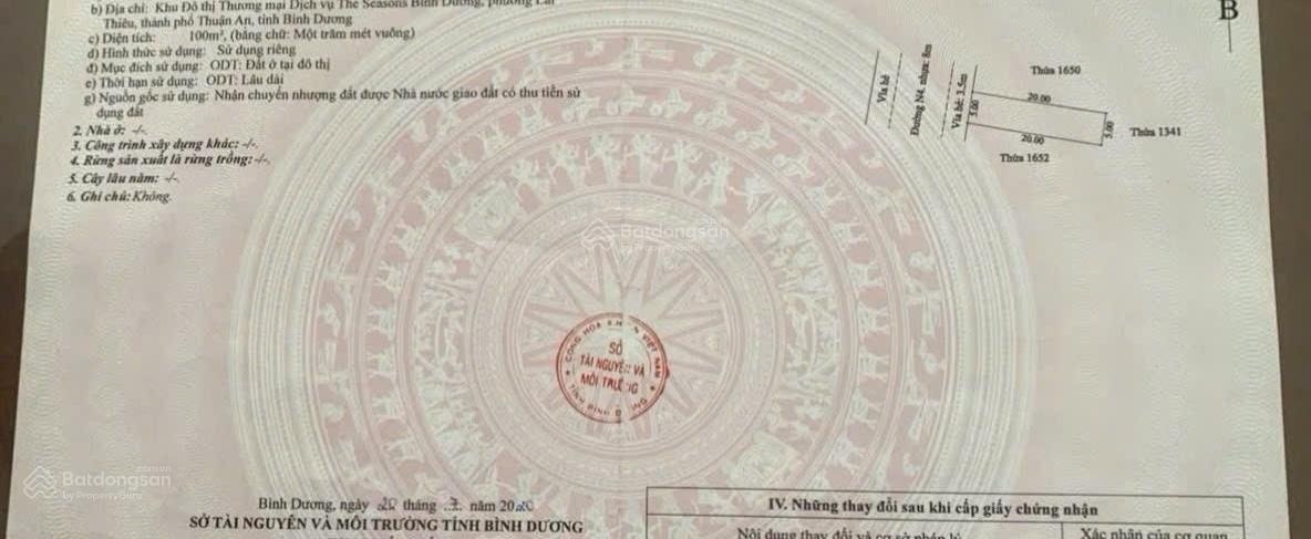 Chính chủ gửi bán đất khu dân cư The Season, trung tâm Lái Thiêu. Cách chợ Lái Thiêu chỉ 500m, tiện ích đầy đủ. Chỉ 30 phút di chuyển đến trung tâm Sài Gòn. Diện tích: 100m² (5x20m). Mặt tiền đường D2, đường nhựa 12m, rộng rãi, thông thoáng. Giá bán: 4,09 tỷ gặp chủ thương lượng. Liên hệ ngay: 0937 526613 để xem đất thực tế.