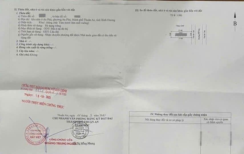 MÃ HTL9015 Bán đất KDC gần vòng xoay An Phú 1km, p.An Phú, Tp.Thuận An DT: 85m2 (5x17m) thổ cư 100% Gần đường Phan Đình Giót 100m Cách đường ĐT743 chỉ 100m Gần chợ Đông Đô 500m Đường 12m bao gồm vỉa hè 3m, đường thông 2 đầu Sổ hồng riêng Hỗ trợ ngân hàng 70% Giá 3tyy500 TL LH 0902946533