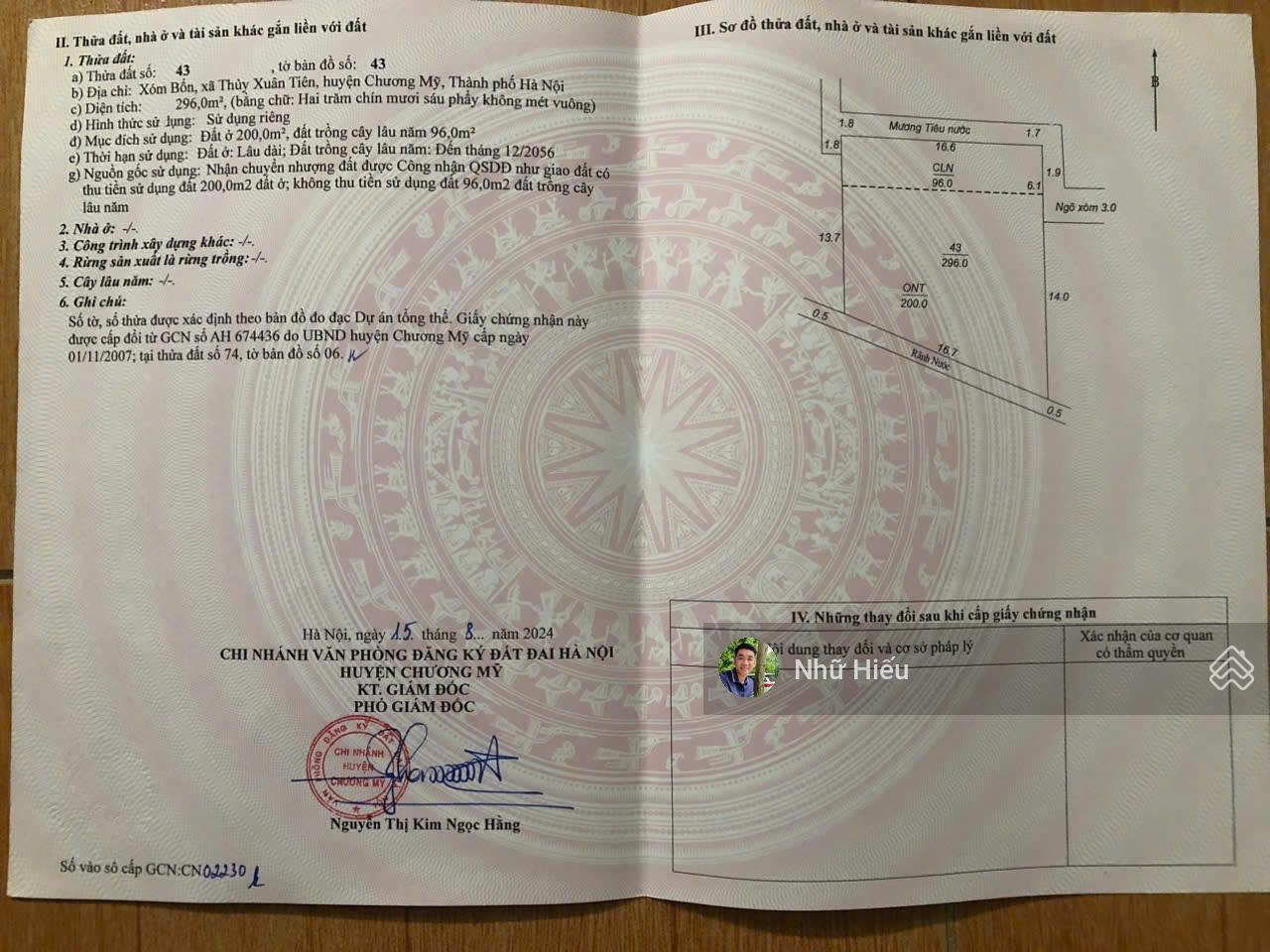 Diện tích đất 296m2 trong đó thổ cư 200m2 còn lại là đất trồng câu lâu năm 96m2.