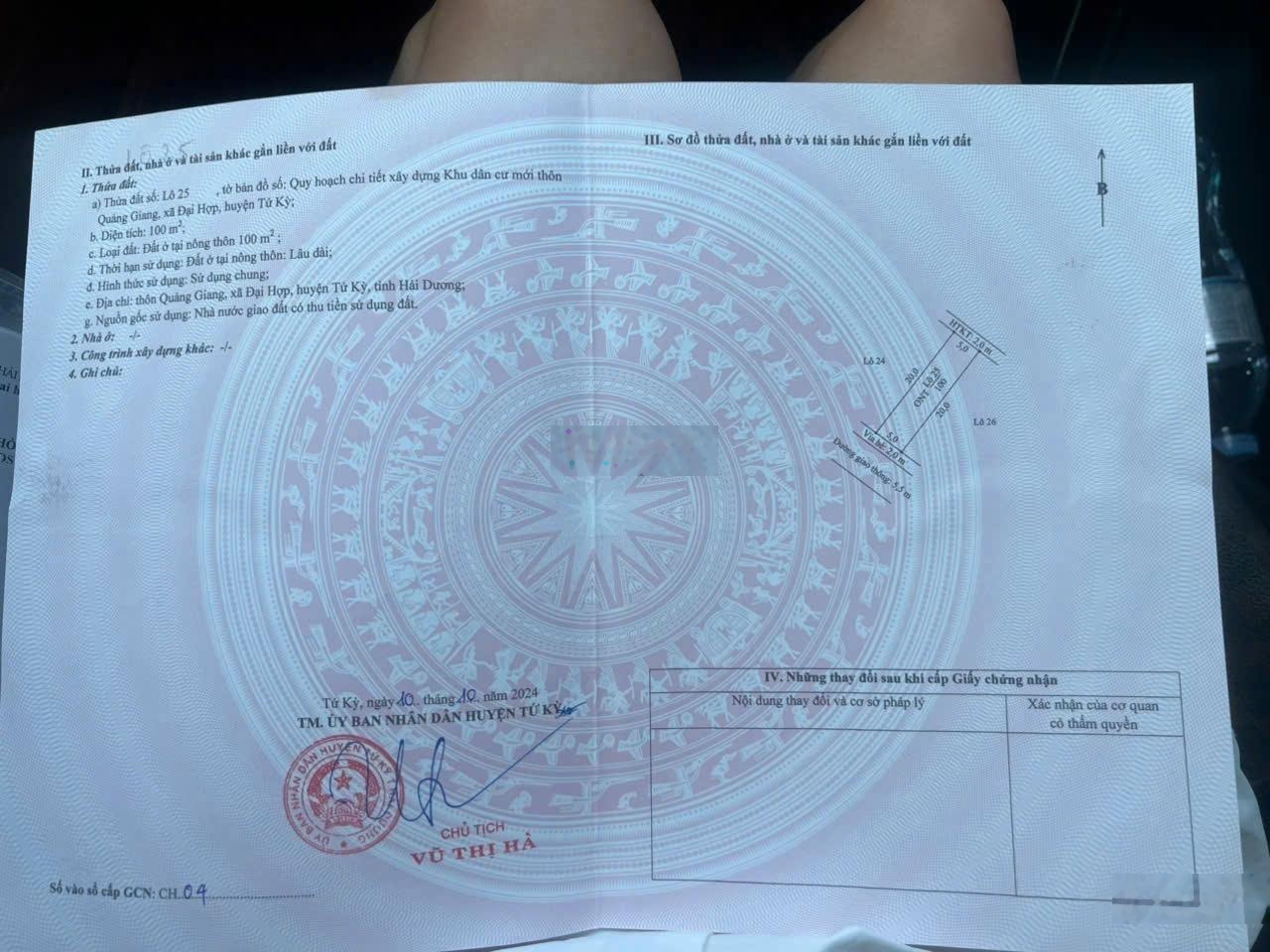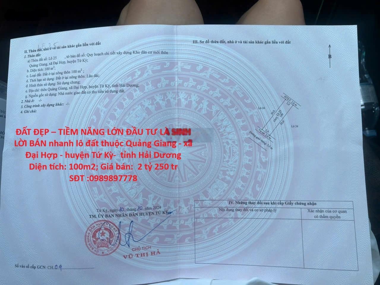 ĐẤT ĐẸP TIỀM NĂNG LỚN ĐẦU TƯ LÀ SINH LỜI BÁN nhanh lô đất tại huyện Tứ Kỳ tỉnh Hải Dương Địa chỉ: Lô đất thuộc Quảng Giang - xã Đại Hợp - huyện Tứ Kỳ- tỉnh Hải Dương ** Diện tích: 100m2, Ngang 5m . Dài 20m ** Giá bán: 2 tỷ 250 tr . Khách thiện chí có thương lượng chút ít. Lh*989897778 - Vị trí đẹp: tiếp giáp trục đường quốc lộ 37- Kết nối giữa thành phố Hải phòng mới & Ninh Giang Thái Bình - Tiện ích xung quanh đầy đủ: gần chợ, bệnh viện, ủy ban , trụ sở công an, khu công nghiệp bao quanh*989897778 - Khu dân cư đông, thân thiện, an ninh đảm bảo. - Phù hợp đầu tư sinh lời , giao thông thuận tiện **989897778 - Pháp lý: SỔ HỒNG RIÊNG, thủ tục sang tên nhanh chóng - Tiềm năng lớn: nhà đất luôn tăng giá theo tình hình BĐS khu vực, đảm bảo sinh lời Liên hệ SĐT*989897778 a Dũng chính chủ .