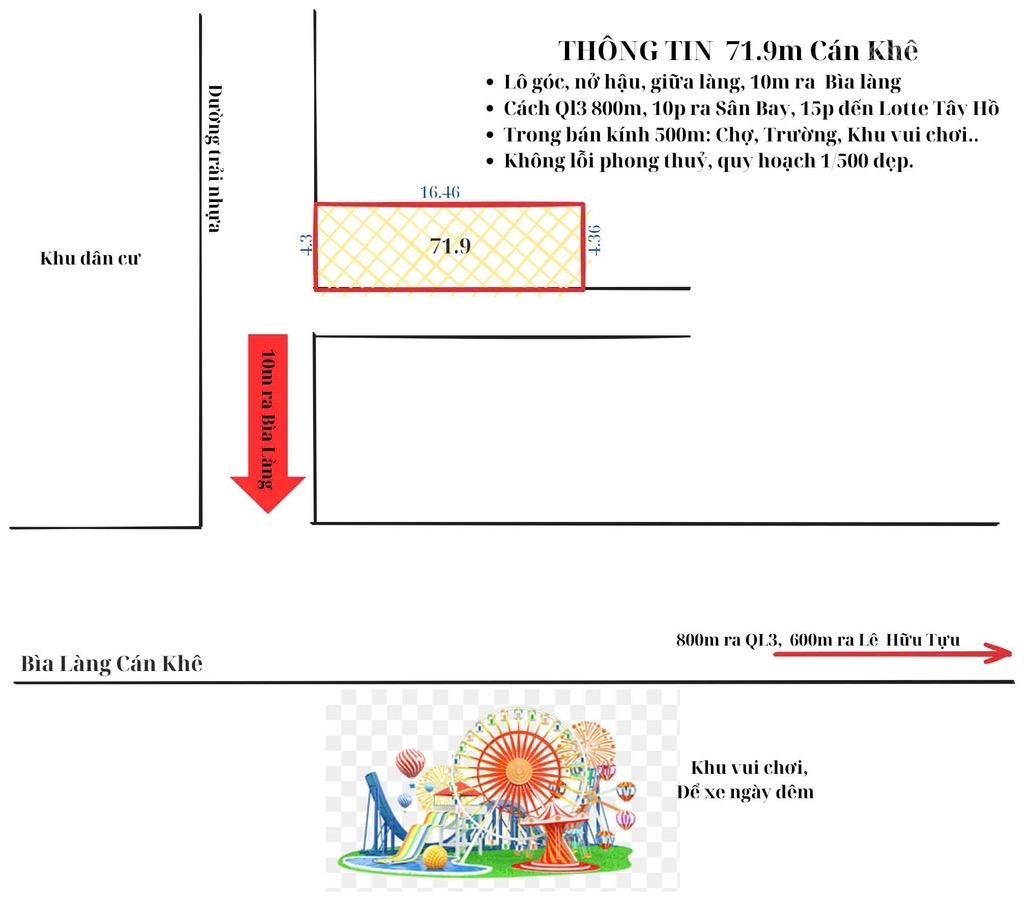 BÁN LÔ GÓC NGUYÊN KHÊ, ĐÔNG ANH - ĐƯỜNG 4M NGÕ THÔNG diện tích : 71.9m2 ( đất ở 54m2 )Mặt tiền: 4.3m ( nở hậu ) Đường trước đất rộng 4m ngõ thông oto 7 chỗ đỗ cửa Đất đẹp vuông vắn , lô góc cách trục chính kinh doanh chỉ 30m, cách sân chơi rộng rãi chỉ 50mVị trí đẹp gần sân bay nội bài, gần TT đông anh Vị trí đất cách đường Võ Nguyên Giáp 300m Vị trí cách trường học Lê Hữu Tựu 200m Vị trí đất cách KCN Nguyên Khê 300m Vị Trí đất cách dự án công viên Phần mềm 1kmKhu dân cư dầm uất, đặc biệt dân trí cao,
