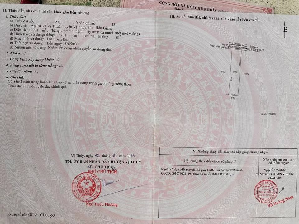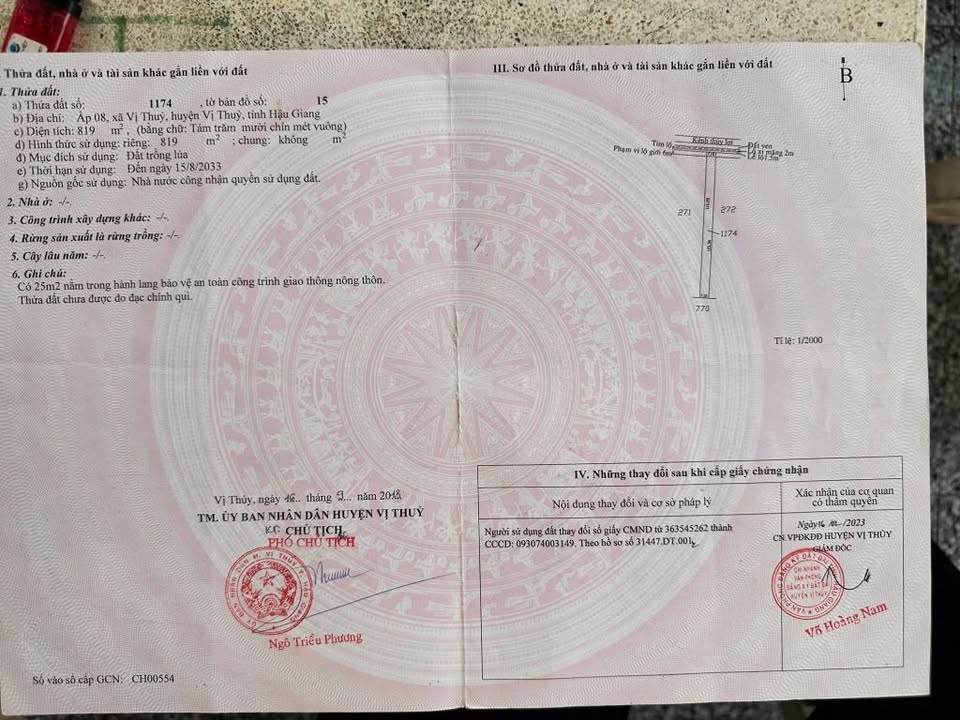 Bán 3.6 công đất (tổng diện tích gần 3600m2, kích thước 30m x 115m) mặt tiền tại xã Vị Thủy, huyện Vị Thủy, tỉnh Hậu Giang, vị trí dân cư đông đúc.