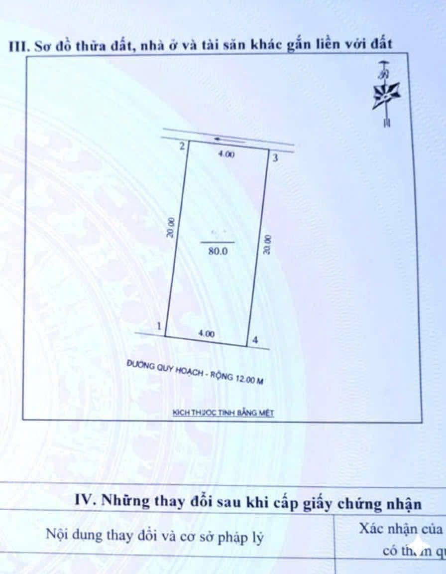 Diện tích rộng rãi 80m2, với mặt tiền lý tưởng 4m và chiều sâu 20m, sẵn sàng cho mọi ý tưởng xây dựng tự do của bạn.