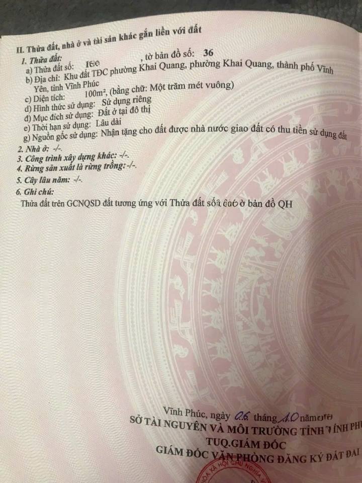 Cơ hội sở hữu ngay ô đất kim cương tại Vĩnh Phúc, vị trí đắc địa ngay mặt bằng 2 đường Lạc Long Quân, Phường Khai Quang, Thành phố Vĩnh Yên. Diện tích 100m2 full thổ cư, mặt tiền rộng 5m, hướng Đông Bắc mát mẻ, đối diện trực diện trường Cấp 1, 2 và trường Mầm non Khai Quang - nơi an cư lý tưởng cho mọi gia đình.