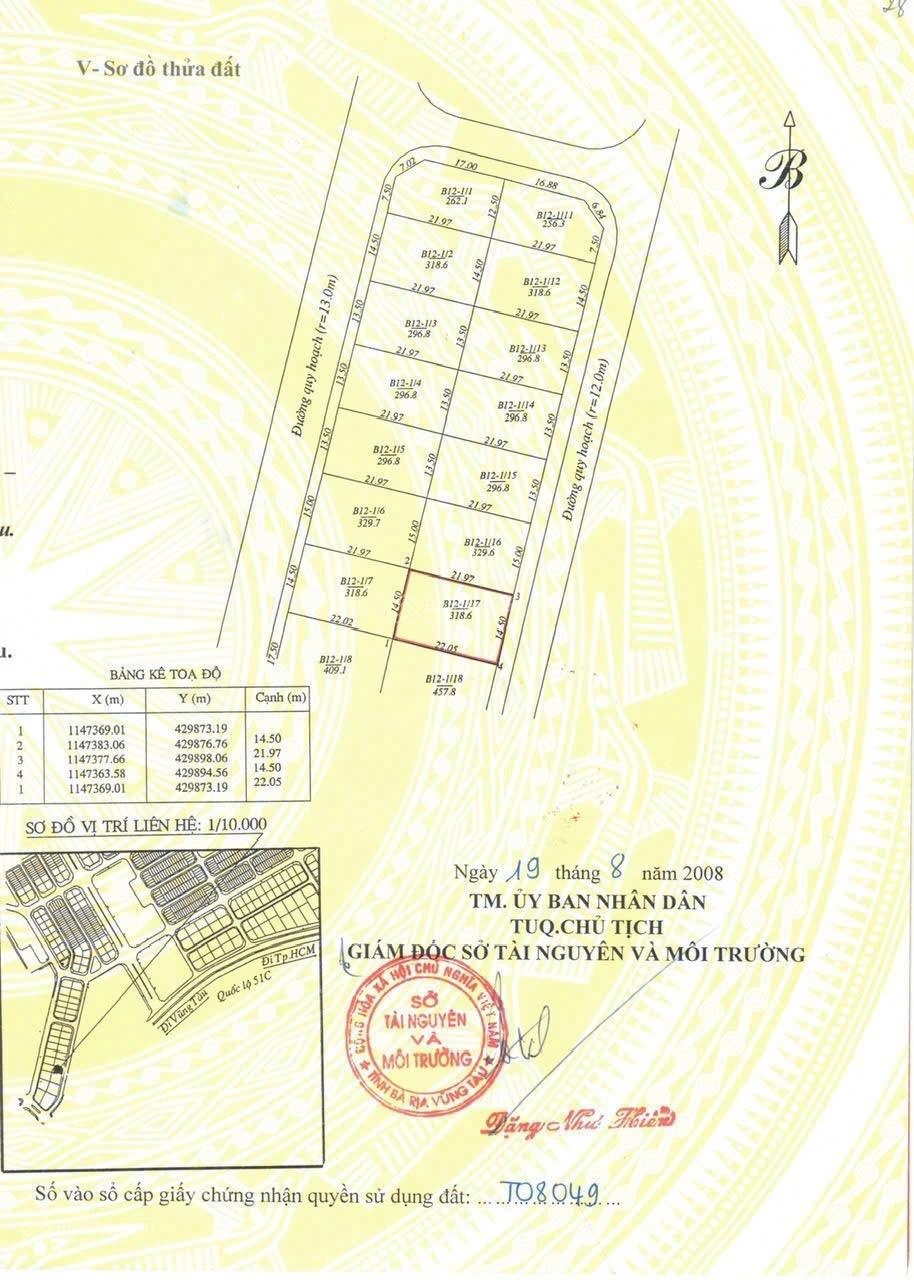 Cần bán lô biệt thự 318m2 ngay KĐT Chí Linh, Vũng Tàu. Đối diện CC Gateway. 14,5x22m. Tổng: 318m2, full thổ cư. Sổ đỏ đầy đủ. Ngay khu dân cư đông đúc, vị trí cực đẹp. Giá: 110tr/ m2. LH: 0933 368 346.