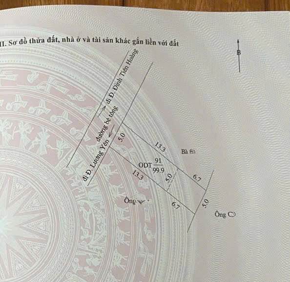 Tìm đâu ra mảnh đất "ngon" như này ở Yên Bái! Diện tích 5x20m đất ở, lại thêm 25m2 vườn tạp "xinh xắn" đối diện, tha hồ trồng rau nuôi cá. Đường bê tông rộng rãi, ô tô tránh nhau "vèo vèo", cách Nguyễn Tất Thành và Đinh Tiên Hoàng chỉ hơn 300m, đi lại cực kỳ tiện lợi. Đặc biệt, quy hoạch phía trước là hồ điều hòa, ban công view thẳng ra hồ, cuộc sống "chill" hết nấc. Gần UBND P. Yên Thịnh cũ, gần tòa nhà Điện Lực, tiện ích xung quanh "đầy đủ". Hướng Tây Bắc mát mẻ. Giá chỉ nhỉnh 1.5 tỷ, còn chần chừ gì nữa mà không alo ngay cho em để xem đất nào!