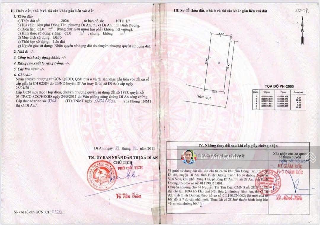 - Diện tích : 62m2. Thổ cư 100%. Ngang 4,57m. Hướng nam.