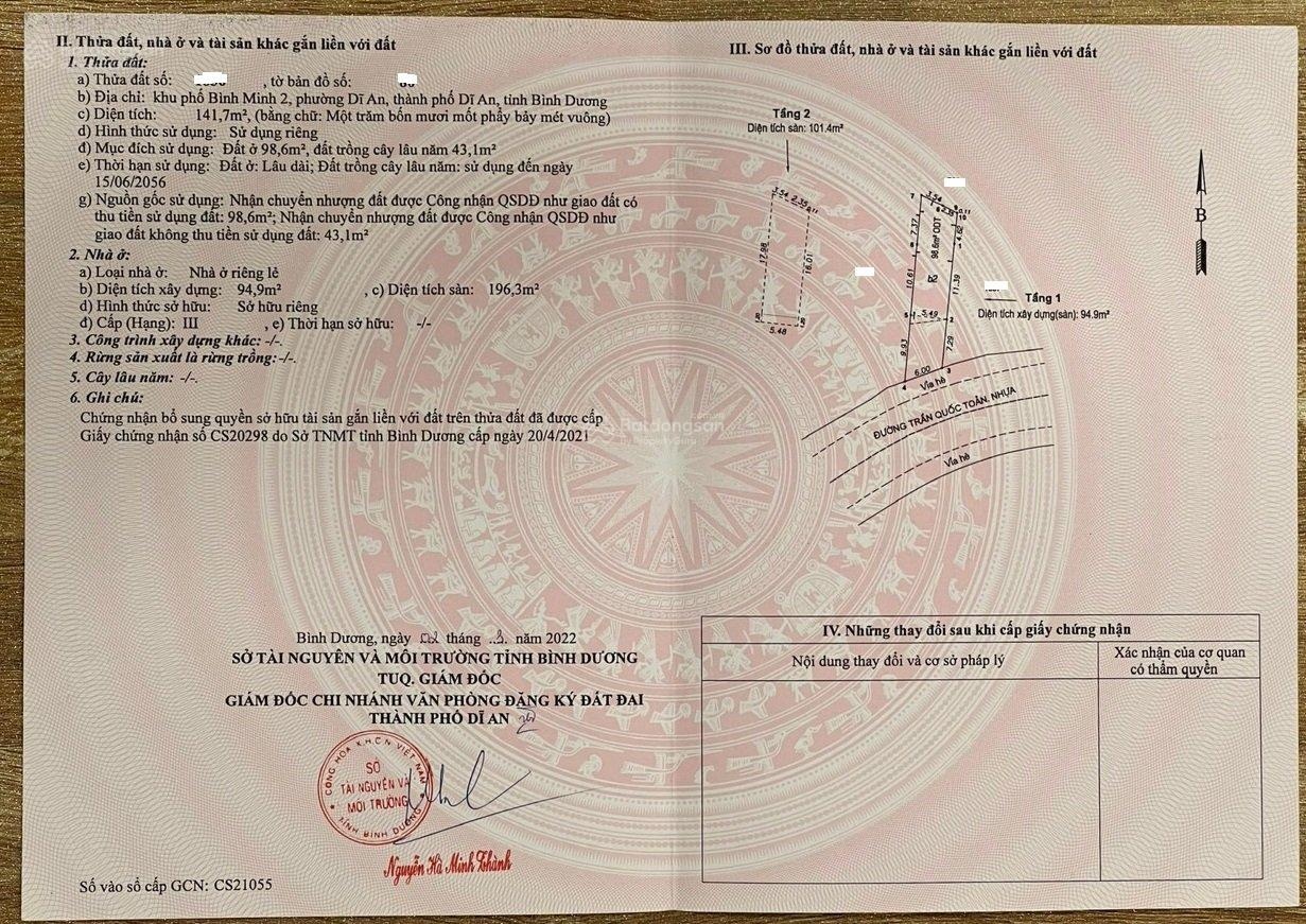 Trục đường kinh doanh ăn uống sầm uất, mặt tiền rộng 6m, hiện tại đang cho thuê 25 triệu/tháng, giá 12.7 tỷ và còn thương lượng chủ. - Vị trí: Mặt tiền Trần Quốc Toản, P. Dĩ An, TP. Dĩ An, Bình Dương. - Sổ hồng riêng, hỗ trợ sang tên miễn phí. - Diện tích: 141.7m2(6x26m), thổ cư 98.6m2, diện tích sàn 196.3m2. - Thiết kế: Nhà 1 trệt 1 lầu hoàn công (mới xây 2 năm) gồm tầng trệt và lầu đều thiết kế thông tầng, có phòng ngủ trên và 2wc. - Hướng Nam. - Đường rộng 14m (lòng đường 8m, vỉa hè 3m). - Cách chợ Dĩ An 1 chỉ 400m. - Hỗ trợ vay ngân hàng. ------------------------------- Xem hơn 65 mặt tiền sầm uất Dĩ An: cuongbds.vn/kd1 Xem hơn 45 mặt tiền sầm uất Thuận An: cuongbds.vn/kd2 Xem hơn 1000 nhà đất Dĩ An & Thuận An: cuongbds.vn