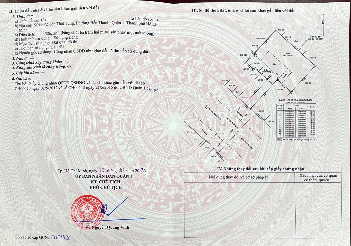 CHUYỂN NHƯỢNG TÀI SẢN VÀNG NHÀ MẶT TIỀN: 88 90 90/2 Tôn Thất Tùng, Phường Bến Thành, Quận 1 Vị trí đắc địa bậc nhất trung tâm TP.HCM - Mặt tiền đường Tôn Thất Tùng tuyến đường 2 chiều, xe hơi lưu thông thuận tiện. Ngay giao lộ Sương Nguyệt Ánh Bùi Thị Xuân Khu vực tập trung cao ốc văn phòng, khách sạn, trung tâm thương mại: Gần chợ Bến Thành, công viên Tao Đàn, tuyến Metro,... - Thông tin khu đất: + Diện tích đất: 9,6m x 25,7m + Nở hậu: 19,7m (lợi thế phong thủy & khai thác xây dựng) + Diện tích công nhận: 430m² + Hiện trạng: Nhà cấp 4 + Kết cấu: Tiện xây mới cao ốc văn phòng, khách sạn, căn hộ dịch vụ - Pháp lý: + Sổ hồng cá nhân + Gồm 02 sổ (cùng 1 chủ sở hữu) + Pháp lý rõ ràng, sang tên nhanh chóng (Thông tin chi tiết thể hiện trên Giấy chứng nhận QSDĐ số CH02317 do UBND Quận 1 cấp ngày 26/09/2011) GCNQSDĐ 88 TTT Giá chuyển nhượng: 320 TỶ - Phù hợp đầu tư: + Xây cao ốc văn phòng + Khách sạn boutique + Căn hộ dịch vụ cao cấp + Giữ tài sản trung tâm tăng giá dài hạn Liên hệ: Mr Phelim 0708683631 Làm việc trực tiếp chính chủ thông tin chính xác