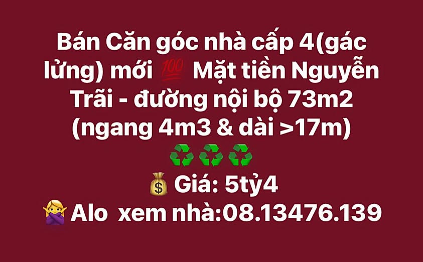 Diện tích 73m2, mặt tiền đường Nguyễn Trãi và đường nội bộ, căn nhà cấp 4 có gác lửng này đích thị là "gu" của bạn rồi đây. Với kích thước ngang 4,3m và chiều dài hơn 17m, không gian sống siêu rộng rãi đang chờ bạn đến khám phá. Giá chỉ 5,5 tỷ, cơ hội hiếm có khó tìm để sở hữu căn nhà "triệu view" tại Sông Hinh, Phú Yên. Liên hệ ngay 0813476139 để xem nhà và cảm nhận sự khác biệt.