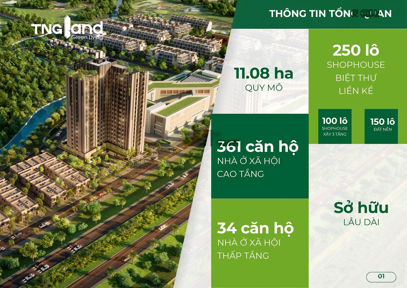 - Dự án rộng hơn 11ha, trong đó chủ đầu tư (Công ty cổ phần TNG Land) dành gần 1ha để xây dựng Dự án nhà ở xã hội với 34 nhà ở liền kề xây dựng 2 tầng, 1 nhà chung cư cao 18 tầng với 361 căn hộ, diện tích mỗi căn rộng từ 26,7m, 70m, được bố trí từ 1 đến 3 phòng.