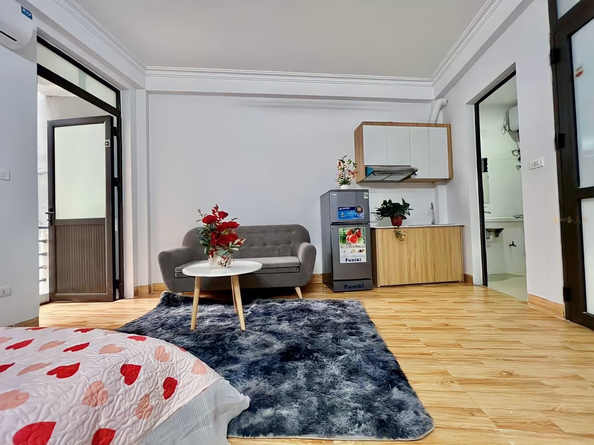 Phòng full nội thất xịn sò, có đủ tủ lạnh, điều hòa, kệ bếp trên dưới kèm hút mùi, giường, tủ quần áo... chỉ cần xách vali đến là ở luôn, không cần sắm sửa gì thêm.